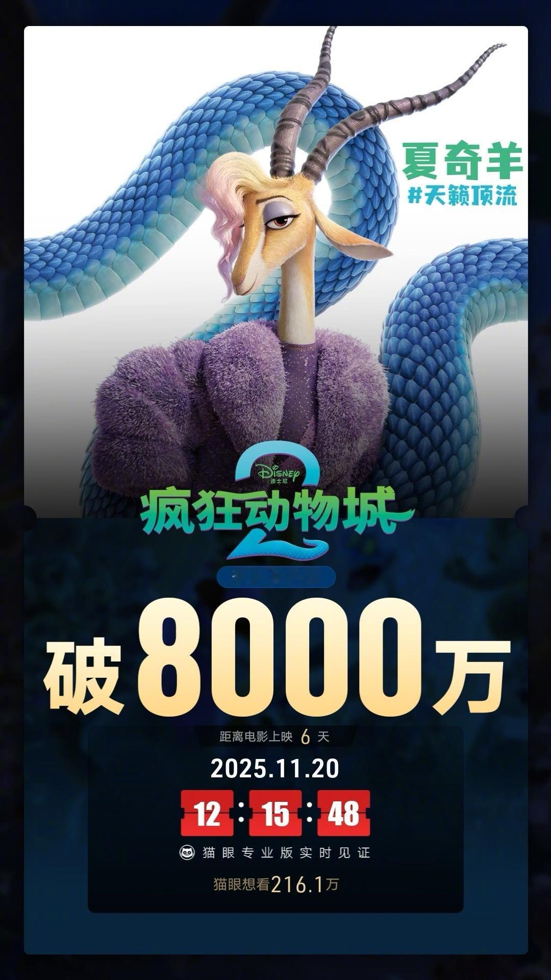 据猫眼专业版数据,电影《疯狂动物城2》映前6天,点映及预售总票房破8000万。
