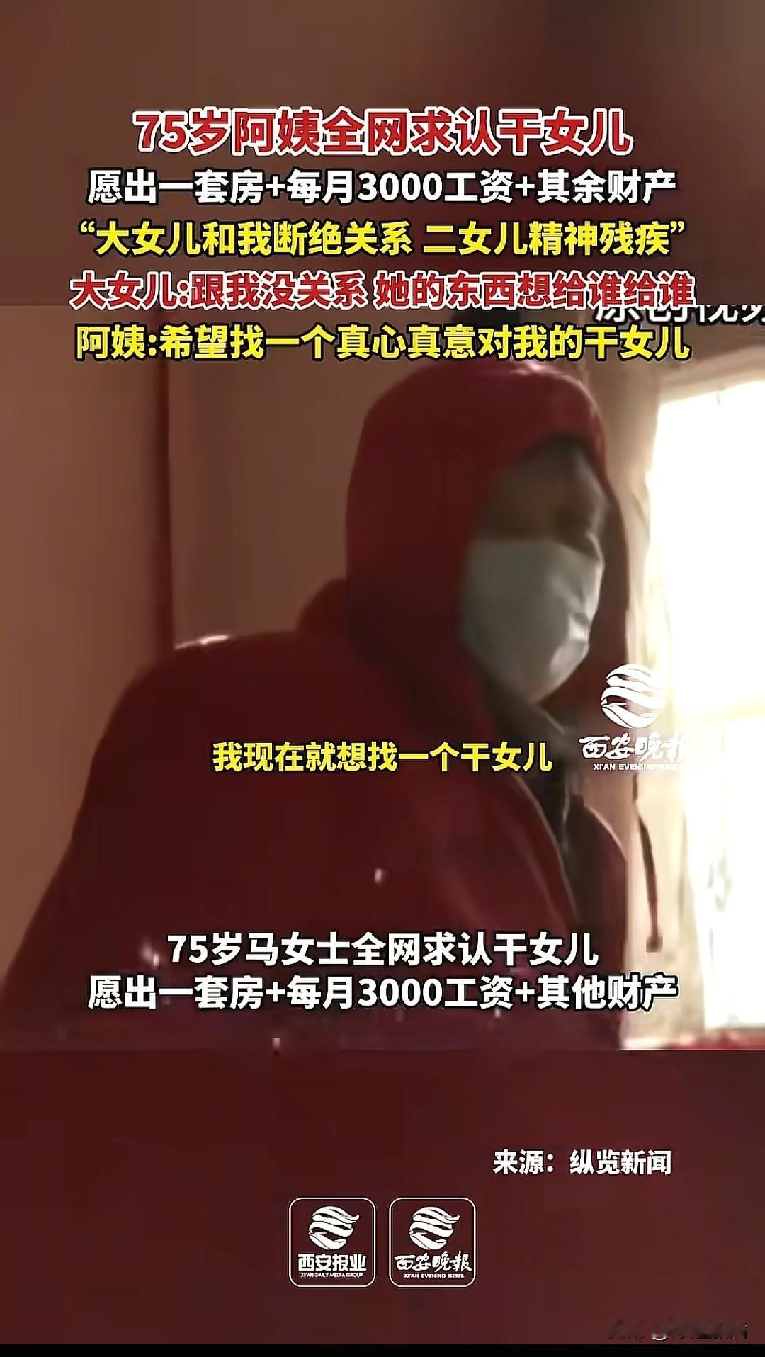 河南郑州75岁大妈全网找干女儿,愿出一套房+每月3000元+其余财产,大女儿和她断绝关系,二女儿精神残疾,马女士早年离异,和家族人员没有了来往,早些年因照看外孙女儿问题和大女儿闹掰,随着年龄增大,阿姨感觉很孤独和不安,想找一位真心对待她的干女儿,养老并签订相关协议。 月薪3000,事少,还能分到一套房,还有这样的好事,希望这位老人能找到一个单纯善良,真心对她的人,而不是贪图她的财产。 (来源于西安晚报)