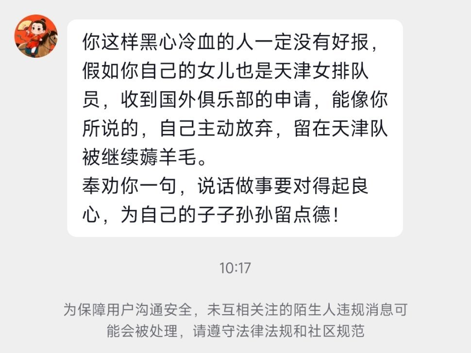 【今球讲】有IP长春的一个号私信我,说我是黑心冷血的人一定没有好报,假如自己的女儿也是天津女排队员,收到国外俱乐部的申请,能像我所说的,自己主动放弃,留在天津队被继续薅羊毛。我今天声明,我没有在任何场合说天津女排队员主动放弃留洋,也没有劝她们放弃留洋。 截至昨天她们赛后接受采访前透露未来规划前,我都没有在任何场合讨论过这个话题,因为你们不懂,网传的这段时间,除了国外俱乐部在调整人员外,也是排超新赛季报名阶段,按理说这都是秘密,流程不走完人家自己都没官宣。 但为什么总有声音让留洋和球队用人对立,是不是有别有用心的人,试图制造和散步球队言论影响外省市和年轻运动员的未来选择?昨天李盈莹和王媛媛的采访都透露着对母队的爱和感恩,也确实,没有球队就没有她们。 现在这种引战,以爱护运动员为幌子拉踩,从以往通过制造话题引发球队和球队对立,球迷和球队对立,发展到球迷对球迷对立,球员和教练对立,球员和媒体对立,你别看现在好像是为了几位明星队员争取权益,其实最后毁掉的是这个项目和行业,最受害的还是运动员。