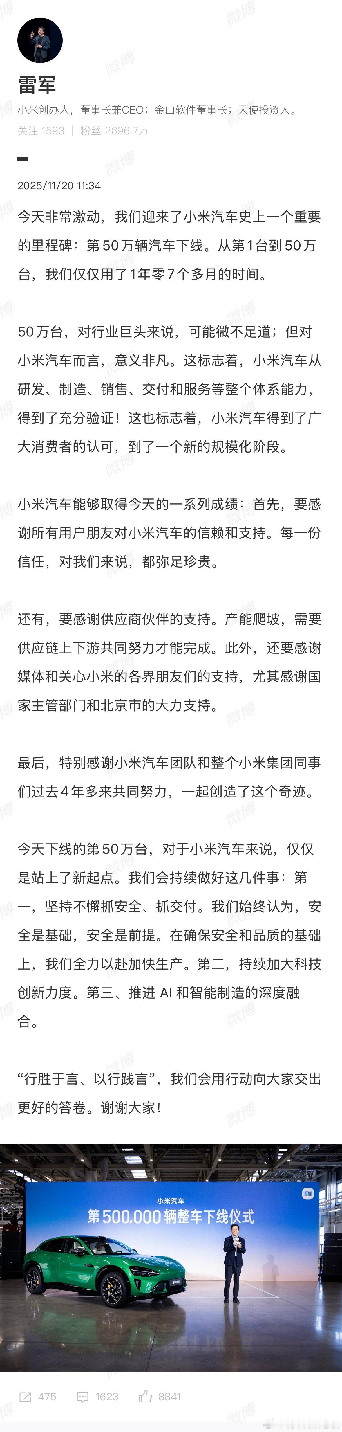 雷军发长文庆祝小米汽车下线50万辆, 602天达成50万辆下线,小米刷新全球新能源车企最快纪录,这不仅是SU7、YU7双车霸榜销量的实力佐证,更是小米体系能力的硬核验证。站在规模化新起点,雷军承诺的“抓安全、强科技、融AI制造”,恰好回应了市场的核心关注点,98个检测工位筑牢安全底线,近百项制造专利夯实技术根基,1100台机器人赋能效率升级。从单季盈利到40万辆年交付目标,小米这份答卷,让科技造车的确定性更足。