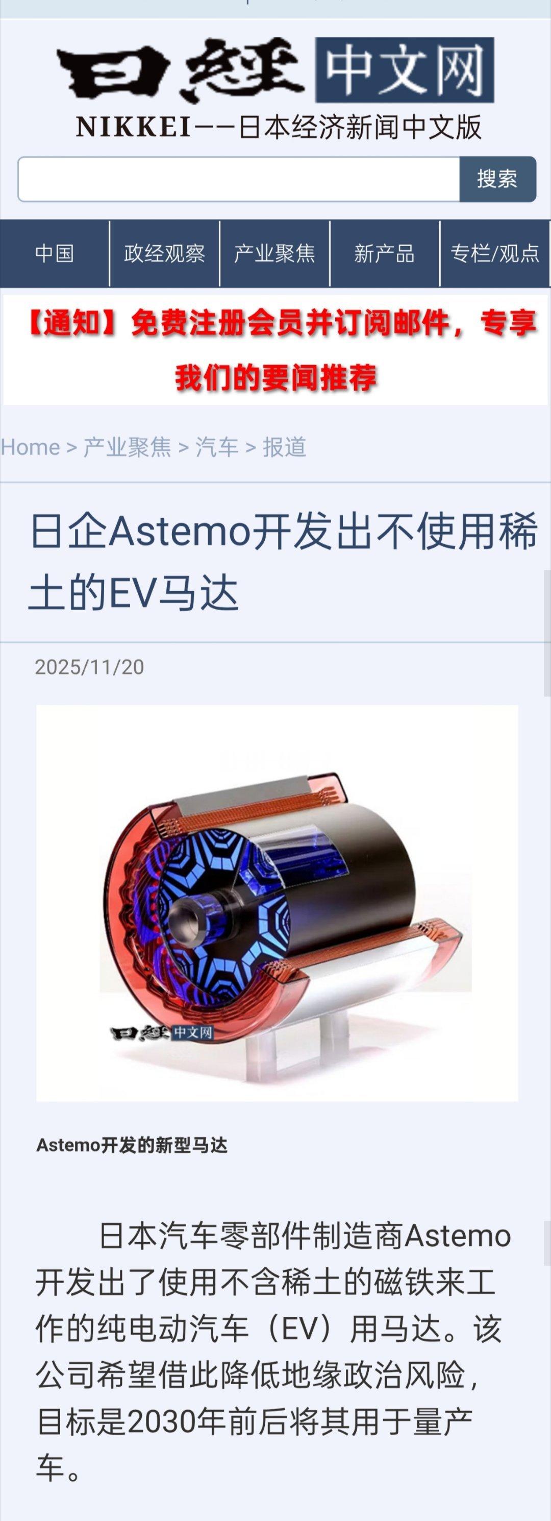 日本汽车零部件制造商Astemo开发出了使用不含稀土的磁铁来工作的纯电动汽车(EV)用马达。该公司希望借此降低地缘政治风险,目标是2030年前后将其用于量产车。EV马达的磁铁此前普遍使用稀土。新产品则嵌入了以价格低廉的铁为主要成分的磁铁。此外,辅助马达不使用磁铁。通过这种组合,实现了总输出功率315千瓦的充足性能。此次开发的产品有望降低马达材料的采购成本。Astemo今后将不断提高EV相关产品的销售额。