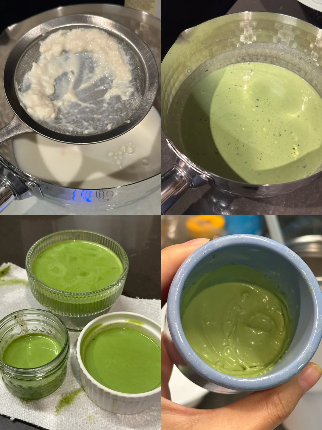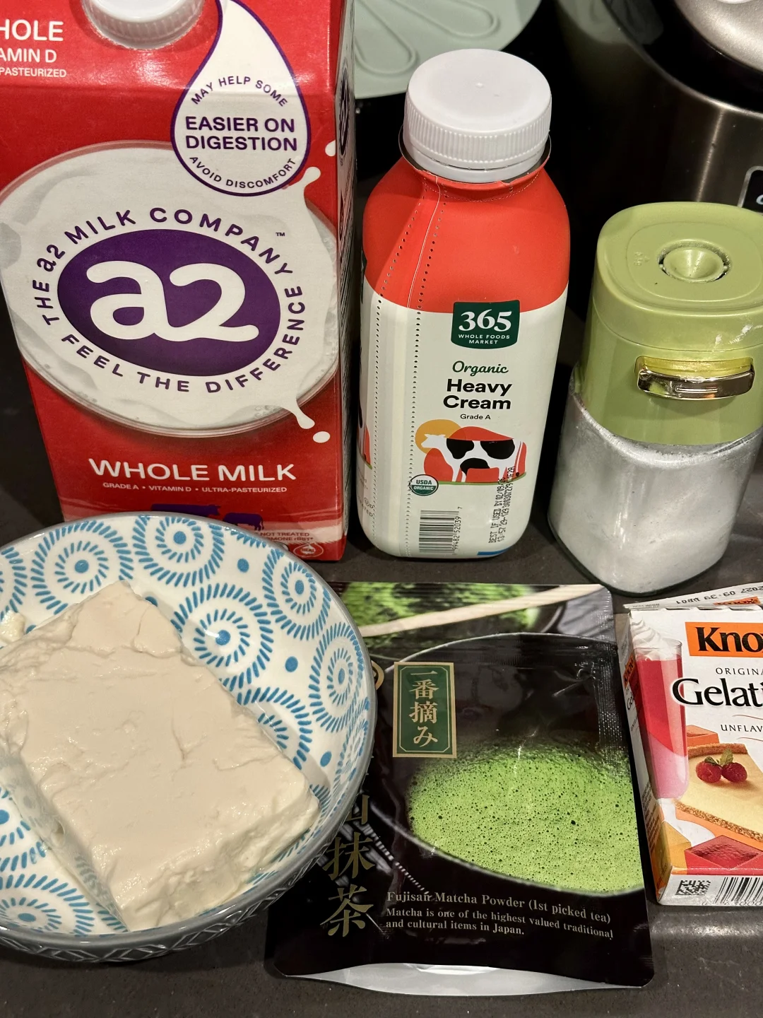 嫩豆腐100g(silk tofu),牛奶100g,奶油40g,白砂糖20g,抹茶粉4g,吉利丁5g。