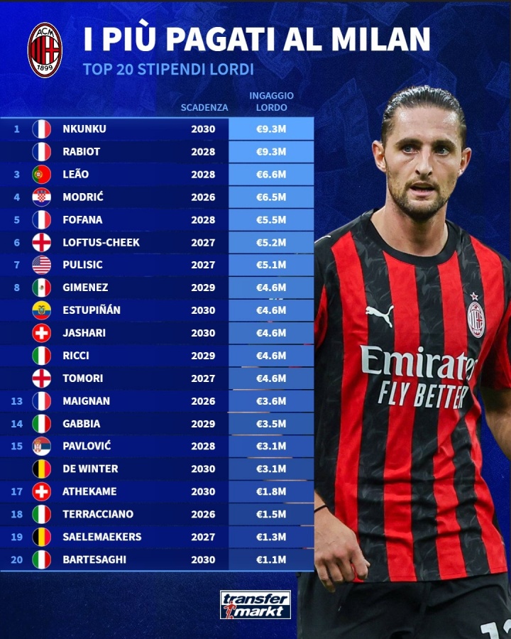 直播吧11月20日讯德转统计了AC米兰队内年薪排行前20的球员,两名法国新援恩昆库、拉比奥特以930万欧元的年薪并列第一,莱奥660万欧排名第三。