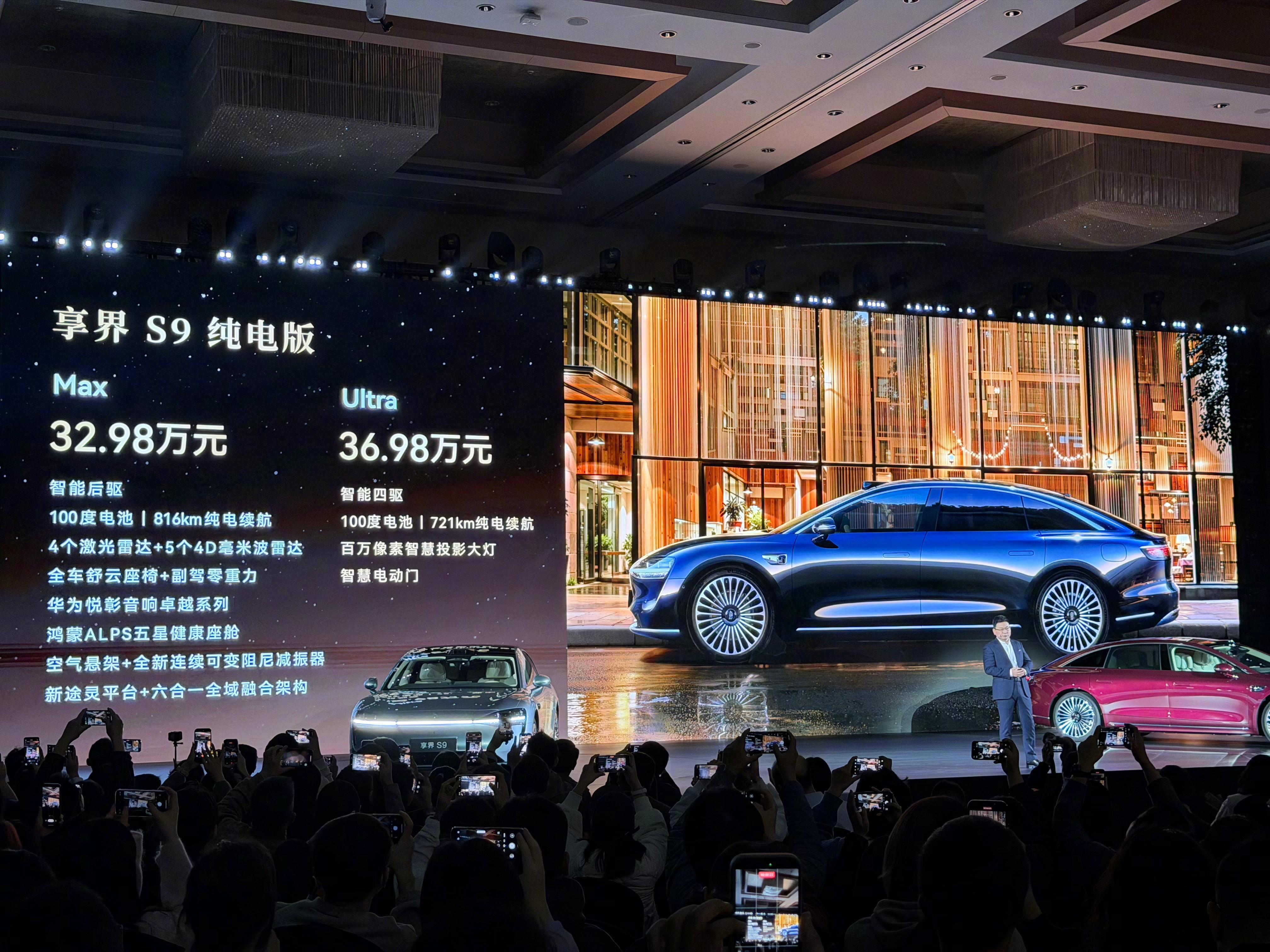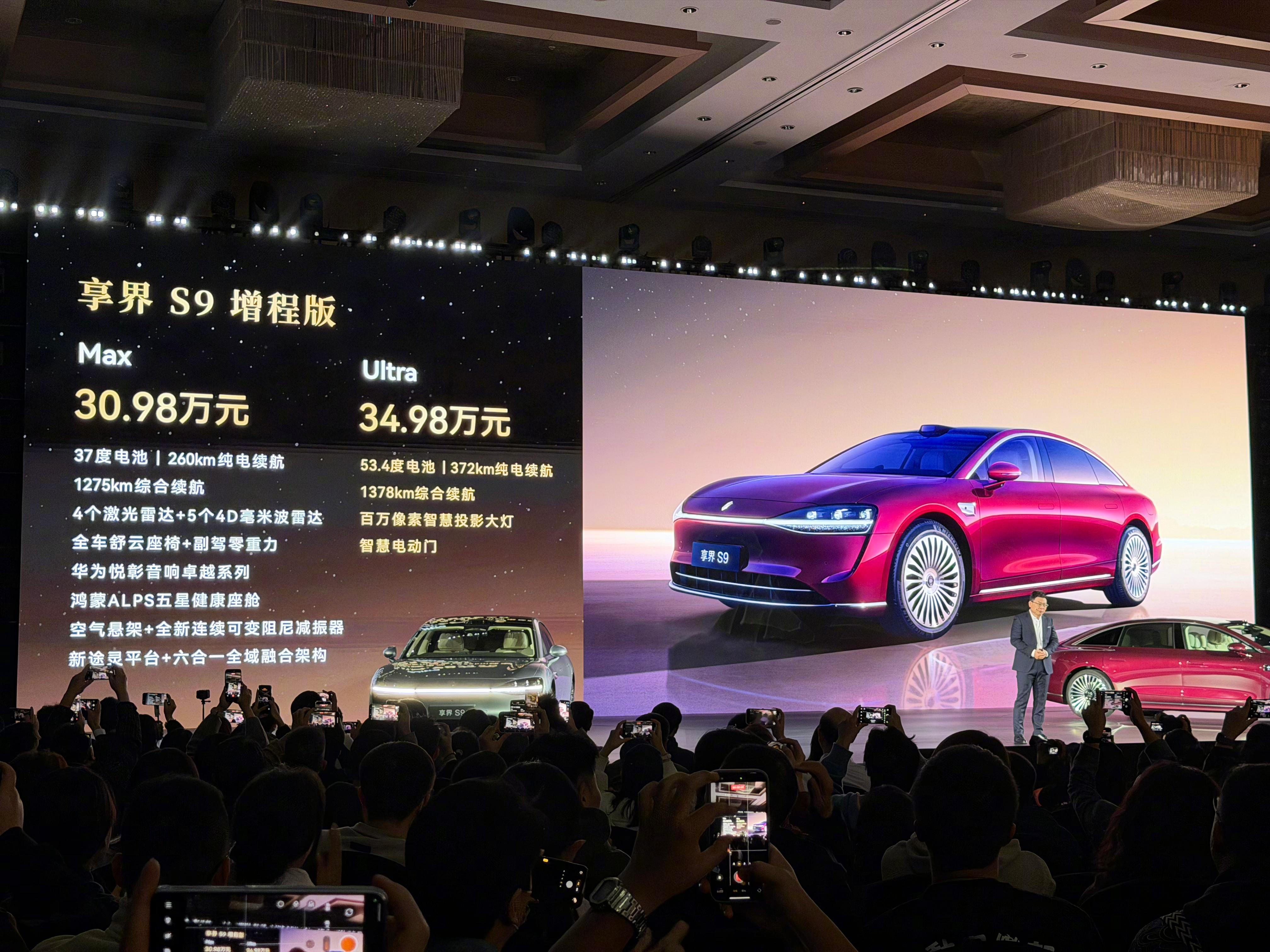新款享界S9正式上市,作为鸿蒙智行年度压轴新品,新车以“全景智慧旗舰轿车”为定位,以旗舰9系科技、跨代智能体验与豪华仪式感配置,重塑30万级豪华轿车价值标杆,为用户带来更享受、更从容的智慧豪华出行体验。 豪华新境:入门即满配,旗舰配置不加价新款享界S9搭载全新寰宇之星车标、寰宇色系车身,仙踪绿、浩宇蓝、寰宇红、流光银、深空灰、鎏金黑6款配色、全新星云尾灯与智慧电动门,并标配舒云座椅、Nappa真皮、进口实木、麂皮顶包覆及1680万色流水氛围灯。智慧迎宾仪式升级至“鹿引星途·诗意宇宙”投影效果,配合华为百万像素智慧投影大灯与交互式迎宾光毯,具备更强识别度与尊崇氛围。智慧新境:十屏豪华满配+智能交互升级享界S9搭载鸿蒙智能座舱,升级16.1英寸中控屏、12.3英寸副驾娱乐屏、MagLink Mini控制屏与智能电子外后视镜,并支持无麦K歌2.0、离车不下电、隔空开门及隔空抓取投屏。智慧电动门支持主副驾隔空开门、智能避障防开门杀,尾门脚踢开启,纯电车型提供电弹电吸前备箱,提升尊贵感与便利性。驾控新境:华为途灵平台加持,舒适与性能兼得新款享界S9基于全新一代华为途灵平台打造,配备五档可调空气悬架、全新连续可变阻尼减振器、前双叉臂+后五连杆独立悬架,并首发“防滑稳定增强”“爆胎稳定控制”等多项安全驾控能力。无惧坑洼、冰雪及连续颠簸,全场景稳定性全面提升;弯道爆胎90km/h仍可保持不跑偏,为大型豪华轿车树立操控与安全新参考。智慧安全新境:36传感器+全维防碰撞4.0享界S9标配36个高精度传感器,包括1个192线激光雷达、3个高精度固态激光雷达、4D毫米波雷达矩阵与车外麦克风阵列,结合华为乾崑智驾ADS 4,实现跨城车位到车位领航辅助,一键直达目的地。全维防碰撞4.0覆盖恶劣天气、移动障碍与开门守卫等多场景,并配合ALPS健康座舱与 9气囊设计,让主动与被动安全全面领先。豪华舒享空间:每一座都是尊享席1962mm座舱横向空间,标配座椅通风、加热、按摩;副驾支持零重力模式,后排可选择零重力套装,打造移动会客厅级体验。私密性同样领先,拥有8块防晒玻璃、7处隐私遮阳帘与全车双层夹胶隔音玻璃,实现百万级静谧与私享体验。价格信息新款享界S9 增程Max版:30.98万元新款享界S9 增程Ultra版:34.98万元新款享界S9 纯电Max版:32.98万元新款享界S9 纯电Ultra版:36.98万元总结凭借旗舰9系豪华配置、鸿蒙智能体验与途灵平台驾控实力,新款享界S9不止补齐传统豪华品牌“智能短板”,更以“入门即满配、不加价即旗舰”的思路挑战豪华价值,成为30万级豪华轿车的全新首选。余总最后还带来了一个小惊喜,鸿蒙智行旗舰MPV即将到来