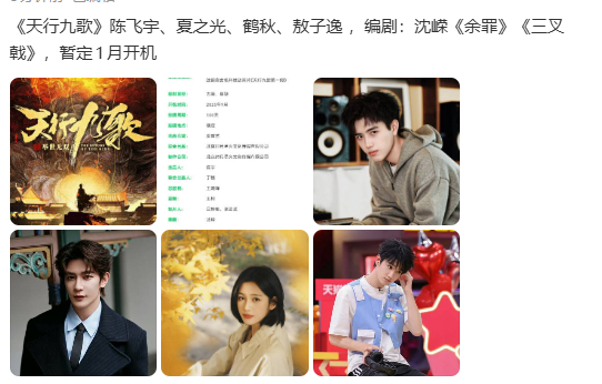 天行九歌主演阵容:陈飞宇、夏之光、鹤秋、敖子逸 ,编剧:沈嵘《余罪》《三叉戟》,暂定1月开机