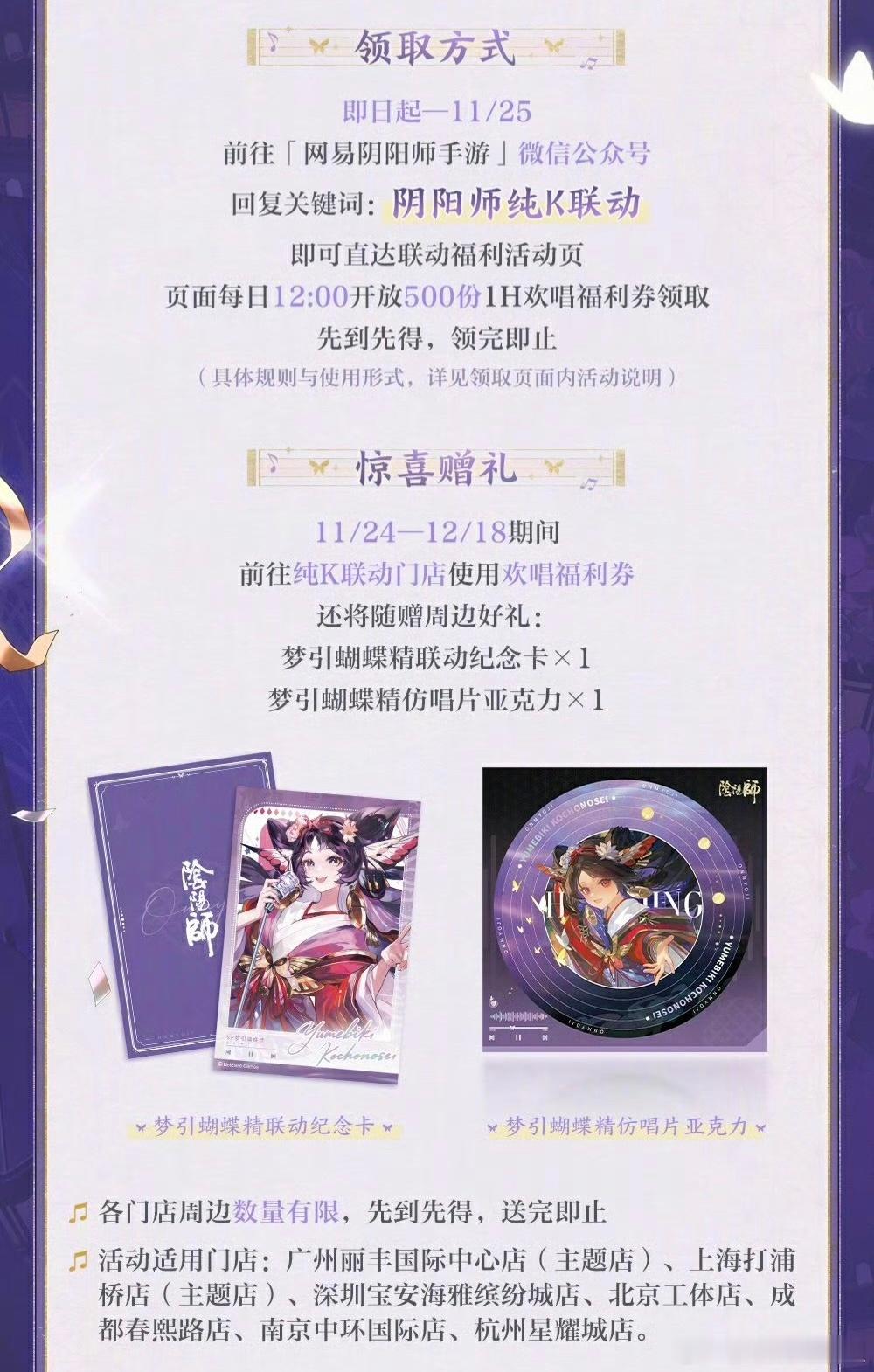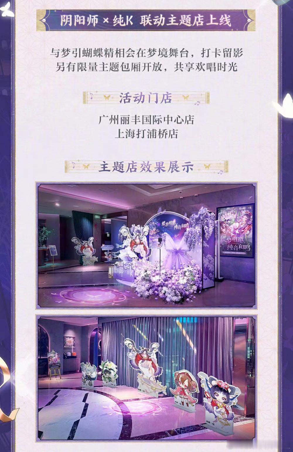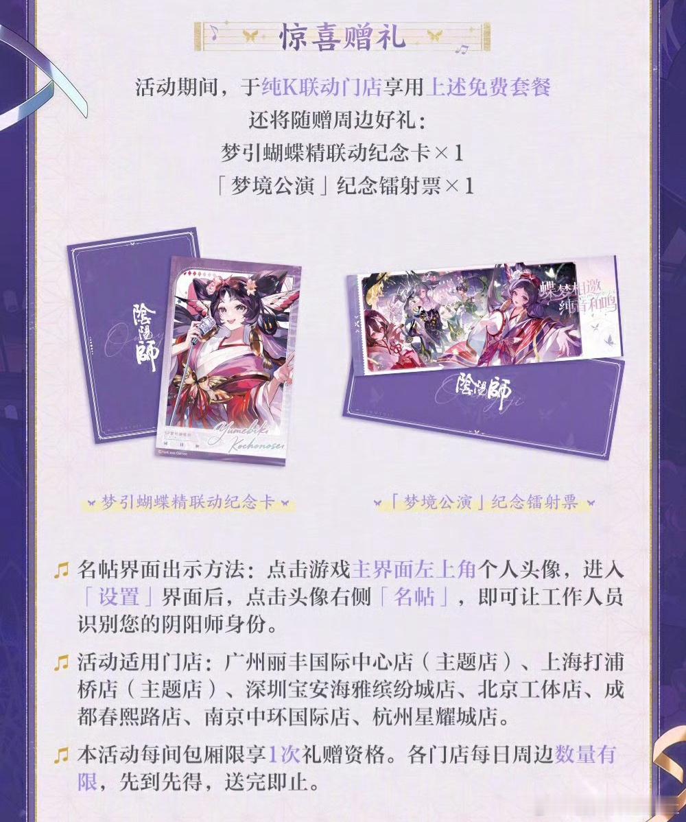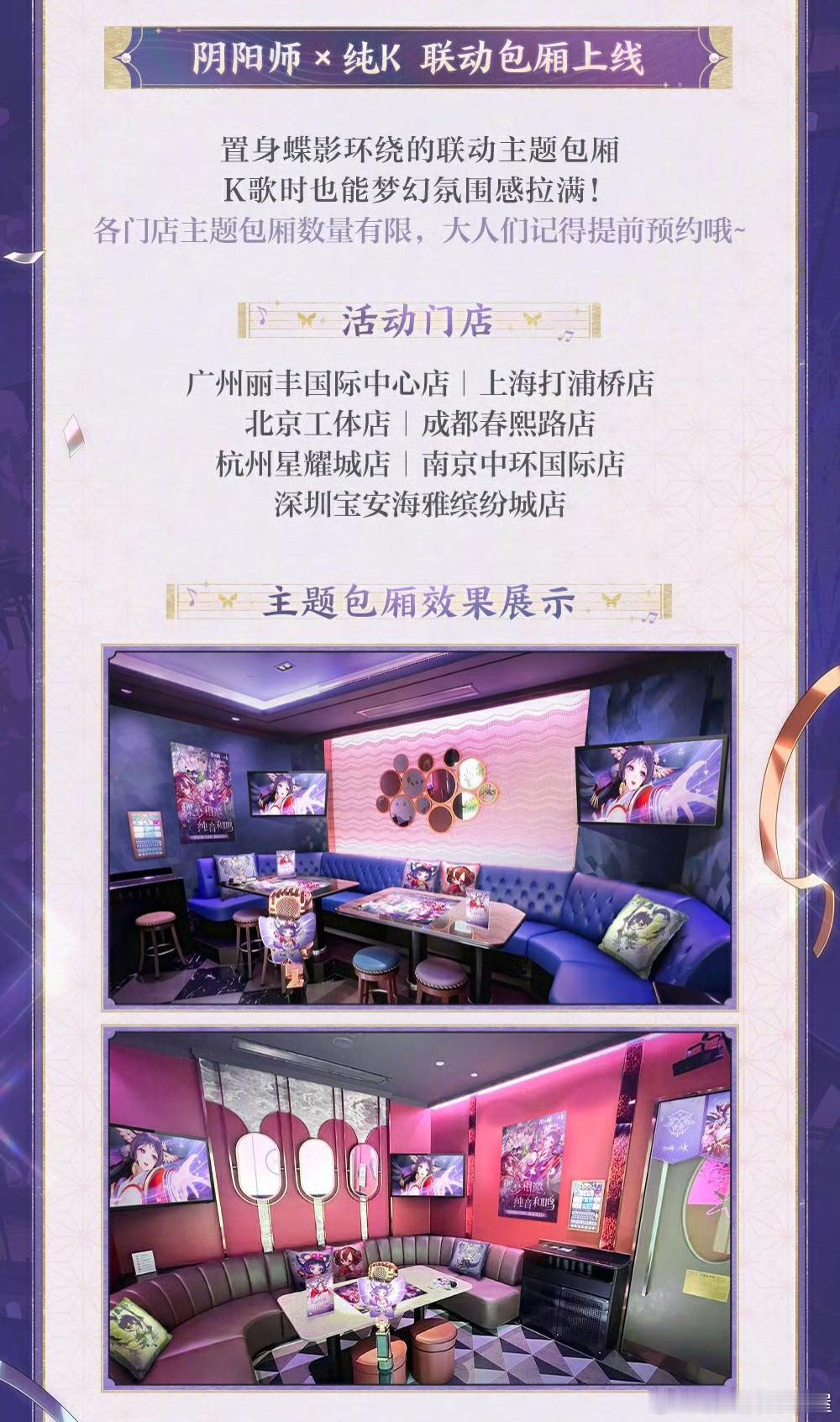 阴阳师×纯K联动和KTV联动特别特别适合我们小蝴蝶。而且还是KTV里最好吃的纯K🥰可惜联动的城市比较少,仅有上海、广州、杭州、南京、成都、北京、深圳 七城。还好我在杭州-