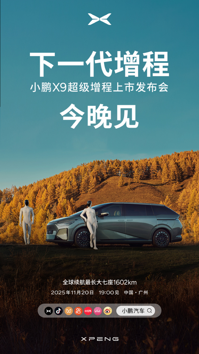 今晚19:00,七座大MPV,1602公里超长续航,小鹏X9增程版今晚上市