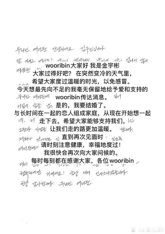 11月20日,韩国🇰🇷明星金宇彬通过粉丝俱乐部晒出他的手写信,官宣他和申敏儿