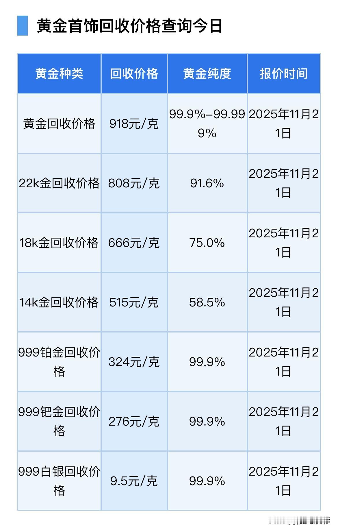 最新 黄金回收价格查询 根据黄金实时价格行情,2025年11月21日,今日黄金行情,现在黄金回收价格918元/克,22k黄金回收价格808元/克,au900黄金回收价格808元/克,18k黄金回收价格666 元/克,14k金回收价格515元/克。 温馨提示:当天的黄金实时金价这里需要注意虚报高价的商家,报价不等于结算价格。 所有信息,仅限于参考! 黄金参考 金价回收行情 黄金售卖价格 黄金回收价攀升 黄金一克720 黄金价格680 黄金回收价
