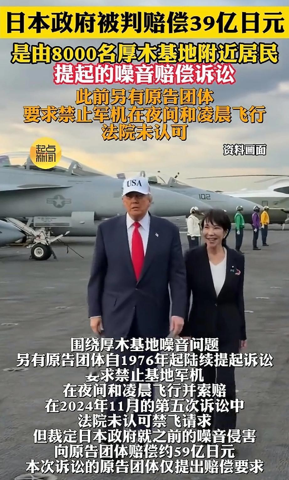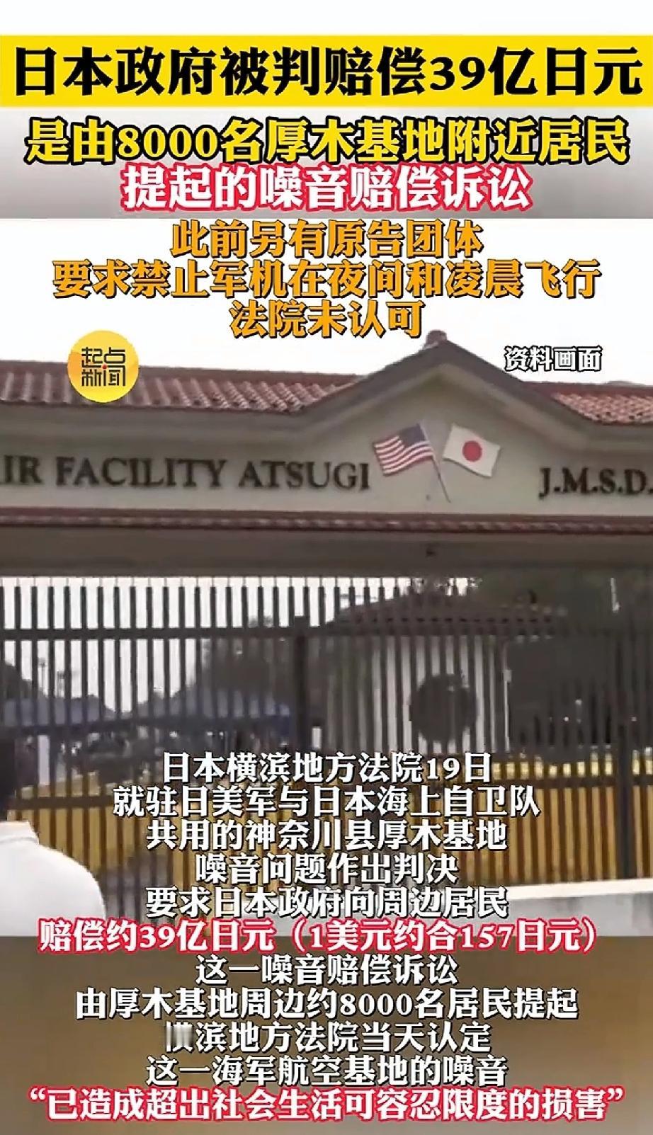 日本政府赔39亿!8000居民赢了官司,却为啥还睡不好觉? 刚看到个扎心新闻:日本横滨地方法院判了,政府得给8000名老百姓赔39亿日元(约1.76亿人民币)!可赢了赔偿的居民们,脸上压根没笑容——这钱,是用几十年的“噪音噩梦”换来的。 这事儿的根源在神奈川县的厚木基地。作为驻日美军和日本自卫队共用的军事基地,这里的战机天天“嗡嗡”起降,噪音早就超标到离谱,比世卫组织和日本自己定的标准高了一大截。居民们晚上被吵得睡不着,白天提心吊胆,身体也越来越差。法官都明说了:就算是军事需求,也不能这么折腾老百姓,这就是非法侵害! 其实这已经不是第一次判赔了。从1976年开始,居民们就没停止过维权,去年11月法院就判过政府赔59亿日元。可最气人的是,钱赔了一波又一波,噪音问题却半点没解决,政府连个像样的根治办法都没有。这次居民们干脆只敢提赔偿要求,估计是对“让战机停飞”彻底不抱希望了。 说到底,这39亿日元更像一笔“遮羞费”。日本政府一边要抱紧美国的军事大腿,一边又得应付老百姓的不满,最后只能拿纳税人的钱买单,却始终不肯触碰问题的根源。对居民来说,钱能补点损失,可谁不想要一个安安静静的夜晚呢? 一场持续半个世纪的维权,其实就讲了一个理:再重要的“同盟”“基地”,也不能踩着老百姓的日子往前走。希望这39亿日元能真的敲醒日本政府,别再让“赔钱—噪音依旧”的循环继续下去了。你觉得光靠赔偿能解决问题吗?欢迎在评论区聊聊你的看法,也别忘了转发给身边人看看这场无奈的“胜利”!日本国家赔偿