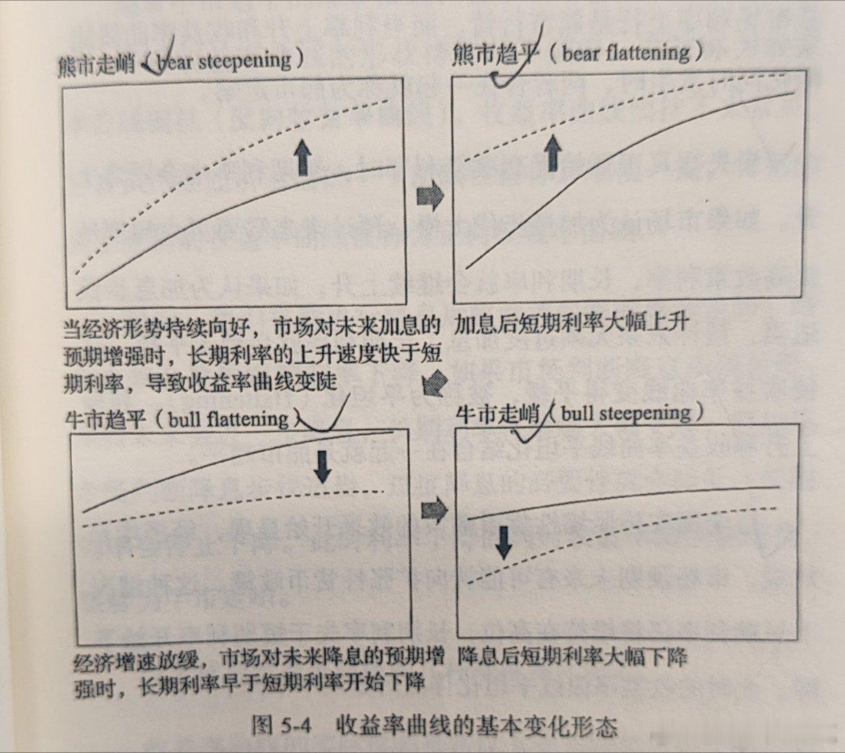 我们梳理一下收益率曲线的典型4种形状。 首先,假设经济形势是货币政策在未来很长时间内都不会发生变化。在这种情况下,作为收益率曲线起点的隔夜利率在未来很可能保持不变,定期利率,尤其是短期利率的水平将接近当前的隔夜利率水平。 由于预计未来货币政策不会发生变化,因此长期利率也应基本保持在同一水平。但随着期限变长,利率水平会因未来预测的不确定性以及期限溢价的增加而逐渐上升。这种情况下的收益率曲线形状十分平缓,并轻微上扬。 如果以这一状态为起点,来探索收益率曲线的4 种基本形态。1)假设在经济向好的同时,对通胀的忧虑也增加,进而对未来施行紧缩性货币政策的预期也会增加。在这种情况下,长期利率将上升到包含未来紧缩性货币政策的水平。如图5-4左上角所示,收益率曲线呈陡峭上升的形状,被称为陡峭化(steepening)。一般来说,当经济繁荣、通胀逐步上升时收益率曲线会呈现此形状。但如果曲线突然出现陡峭化变动,则可能是市场对“落后于曲线”的担忧陡增的体现,可视为通胀的预警信号。 投资者对市场看跌时,市场被称为熊市。当投资者看跌债券时,债券会被抛售,导致利率(收益率)上升,因此债券市场利率上行是熊市行情。而当利率上升和收益率曲线陡峭化同时发生时,两者合在一起就称为熊市走峭。 2) 当央行真正开始提高政策利率时,短期利率也会随之上升。如果市场认为加息步伐太慢,预计未来需要更大幅度地提高政策利率,长期利率就会继续上升;如果认为加息步伐适当,预计未来无须过度加息,长期利率就会趋于平稳。这使收益率曲线变得平缓,被称为平坦化(flattening)。利率上升和收益率曲线平坦化结合在一起就是熊市趋平。 3)待全面实施紧缩性货币政策的效果开始显现,经济增长放缓,市场预期未来有可能转向扩张性货币政策。这种情况下短期利率仍将维持在高位,长期利率先于短期利率开始下降。此时的收益率曲线平坦化伴随的是利率下降,利率下降意味着债券被大量买进,因此投资者对市看涨的。一般来说此时的市场被称为牛市,因此债券市场利率(收益率)下降被称为牛市行情。利率下降和收益率曲线平坦化两者组合在一起就被称为牛市趋平。 4)随着牛市趋平的逐步推进,长期利率会变得低于短期利率,导致收益率曲线的形状持续向下倾斜,这被称为收益率曲线倒挂(反向收益率曲线)。收益率曲线倒挂不太常见, 它被认为是经济衰退的一个前瞻性指标。顺便一提,常见的向上倾斜的收益率曲线被称为正向收益率曲线。 最后,我们来看央行降息后收益率曲线的典型走势。降息自然会导致短期利率下降。如果市场判断降息步伐过慢, 预测未来会进一步降息,长期利率将继续大幅下降;但如果市场判断降息步伐适当,过度降息的必要性就会降低,长期利率会停止下降。此时利率下降的同时收益率曲线陡峭化, 被称为牛市走峭。