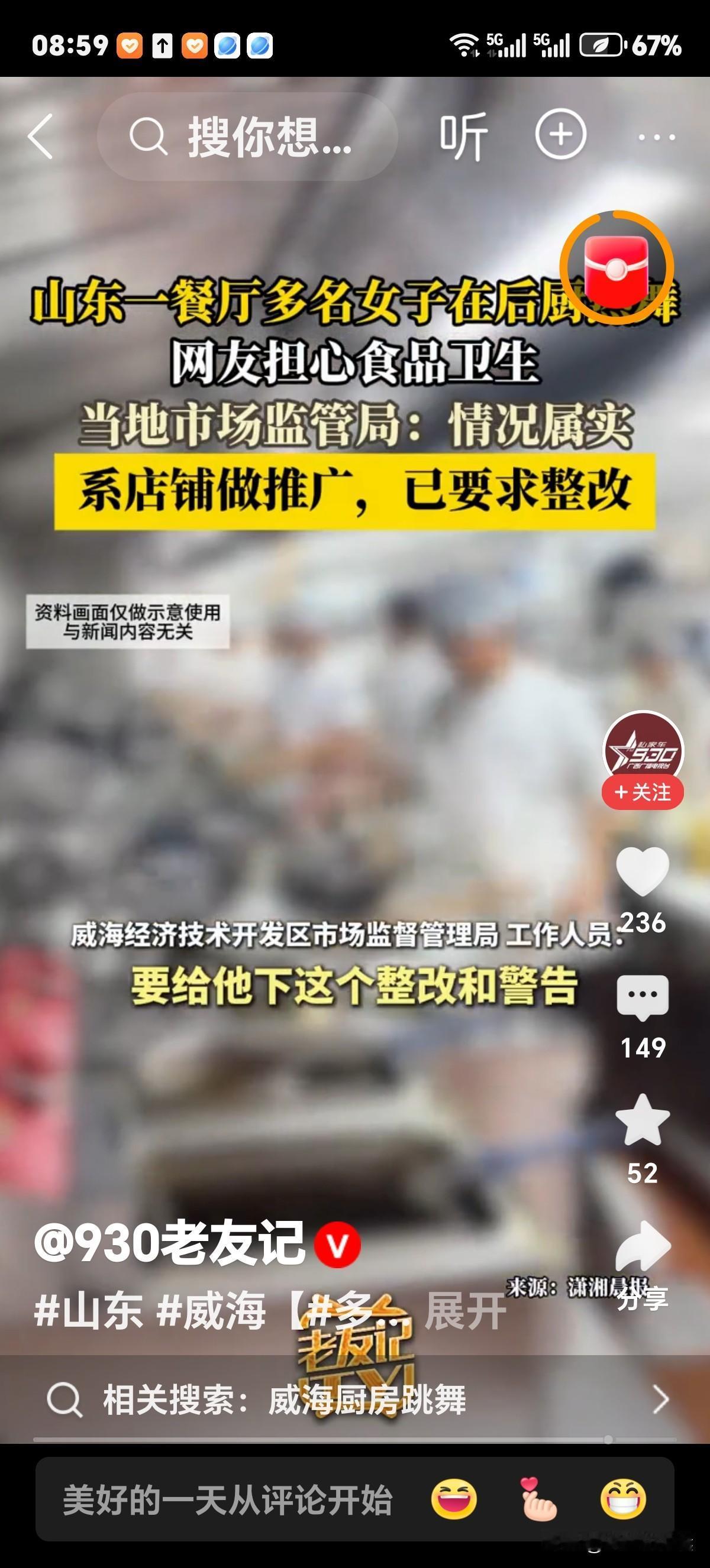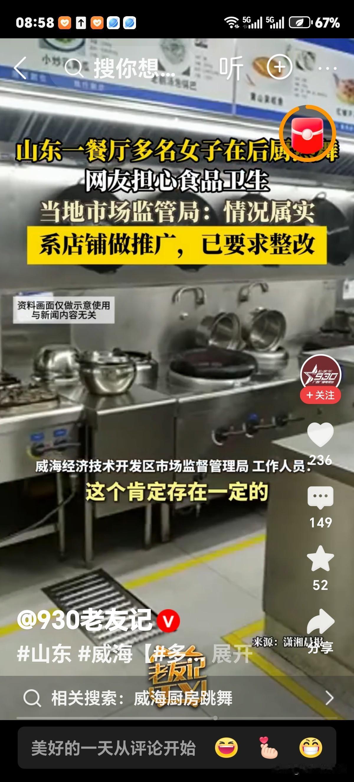 餐厅后厨女子群舞!厨师一脸懵逼,食客满腹胀气。名曰推广!啥哪?多位女子化妆品,香水或乙肝,肺结核病菌吗? 人类任何行为,皆需要情景及场景和所从事物相配套,否则驴唇不对马嘴,易产生恶心不伦不类之效果。如:在厕所弹钢琴!浴堂里绘山水画!葬礼上舞狮子一样不和谐。 再说后厨是闲人免进地方,不是什么人都可以进出,更何况多人跳舞了?舞者虽不是大妈,但也难兔身带病菌,至少没有健康证。故很难叫食客们放心饮食,餐后自然忐忑不安呀。 报道称跳舞时厨师未工作,可笑不?难道病菌因为不炒菜就不满屋子跑了吗?况且传染病菌随空气飘,可不管你工作不工作,也不分大厨还是切墩和食客。照样传播病毒! 综上所述,我认为后厨安全是食品安全重要一个环节。希望山东有关部门加强管理,对该事件有关方给于严惩方好!不能因一句,"厨房没加工操作"搪塞之词,而从宽处理。毕竟食品安全是群众最关心问题之一!笔者相信山东省食品安全监督部门,会给网民们一个满意处理结果,静候后续报道!