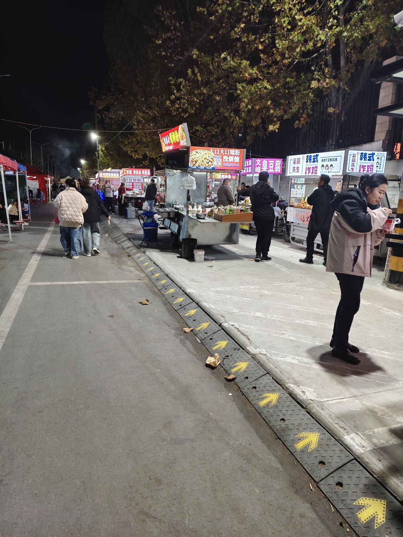冬夜街头的烟火气,这才是生活该有的样子! 晚上遛弯撞见条夜市街,路灯把热气都裹暖了~ 夜风吹得树叶哗啦响,脚边减速带的黄箭头亮得晃眼。臭豆腐的味儿刚飘过来,韩式炸鸡的甜香又钻鼻子里了。 穿厚外套的姑娘边啃边逛,大哥在粉摊前搓着手等号,地上那片落叶和皱巴巴的纸巾,都是这热闹里的小细节。 没多贵的小吃,没多精致的环境,但这热乎劲儿,就是最让人踏实的温柔啊!