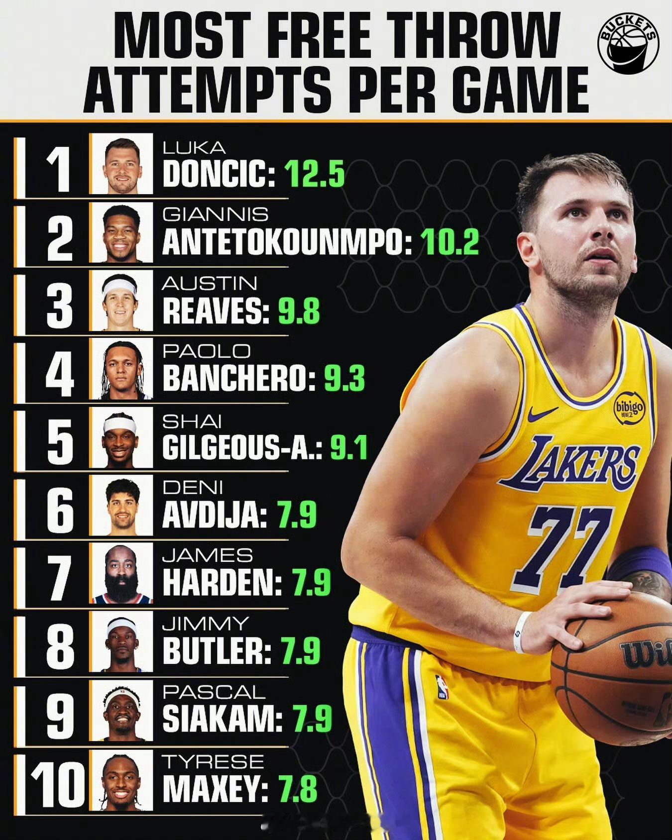 本赛季场均罚球数TOP10,湖人队两人闯入前3😮东契奇12.5次第一,里夫斯9.8次第三。你认为哨子很多的SGA仅排第五。