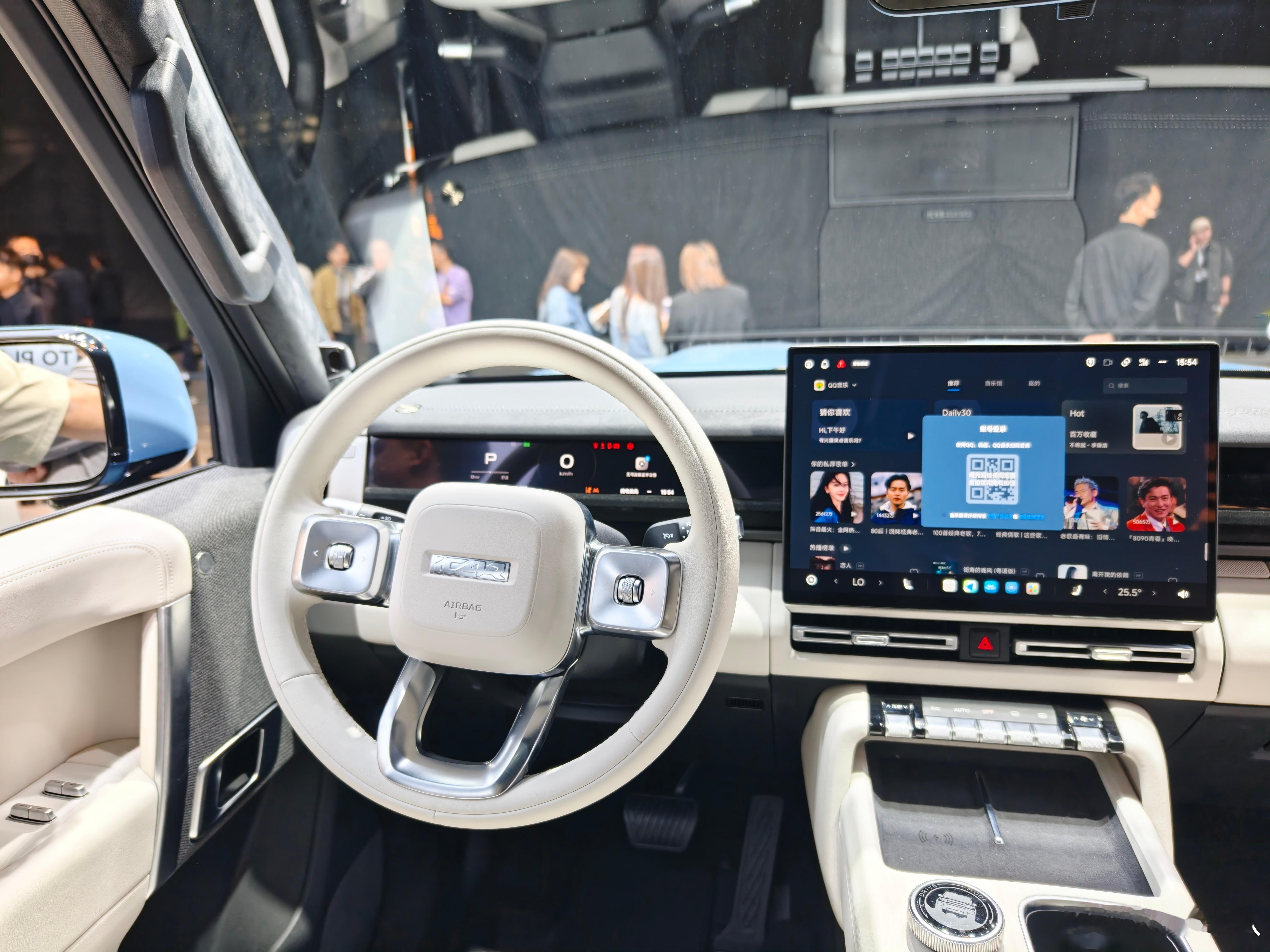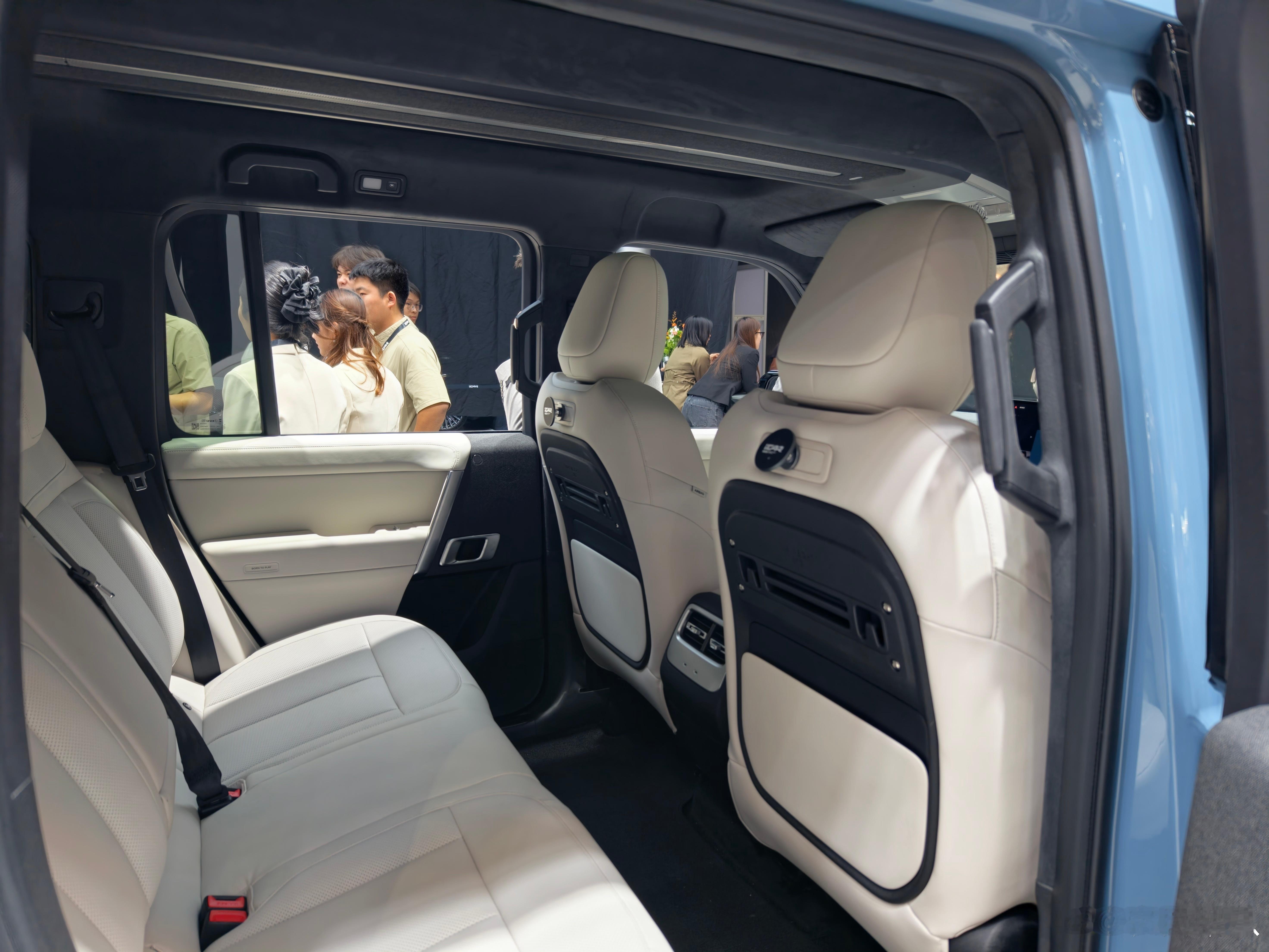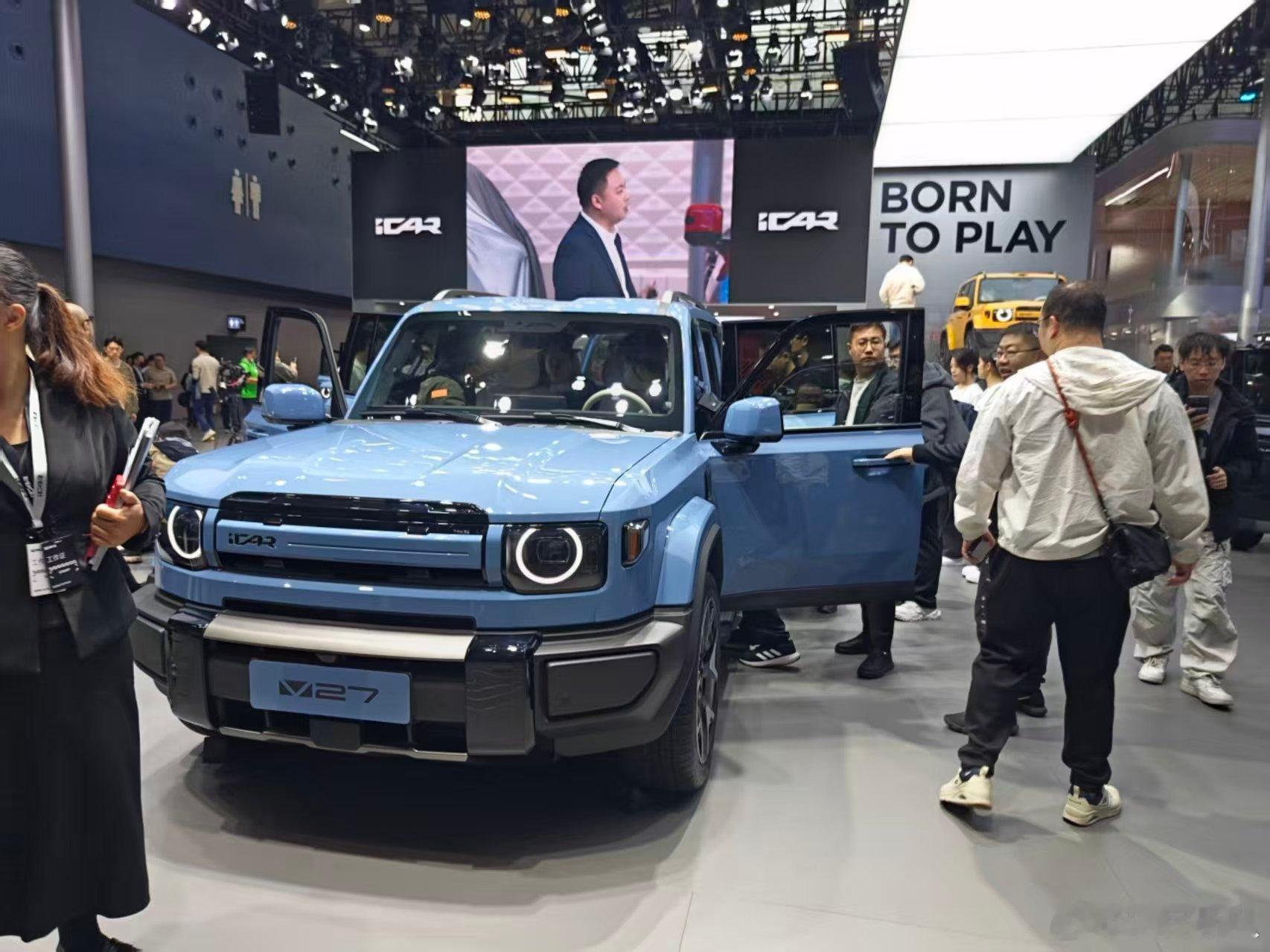 iCAR V27广州车展首秀现场看真的大,本来尺寸就大(备胎版车长5055mm,储物版4909mm)再加上方盒子车型天然的车高优势,确实实车很有气场离地间隙220mm,涉水深度600mm,可以搞个轻越野了智能层面 高通骁龙8295P芯片 + 15.4英寸中控屏地平线HSD系统(征程6P芯片)+猎鹰700辅助驾驶