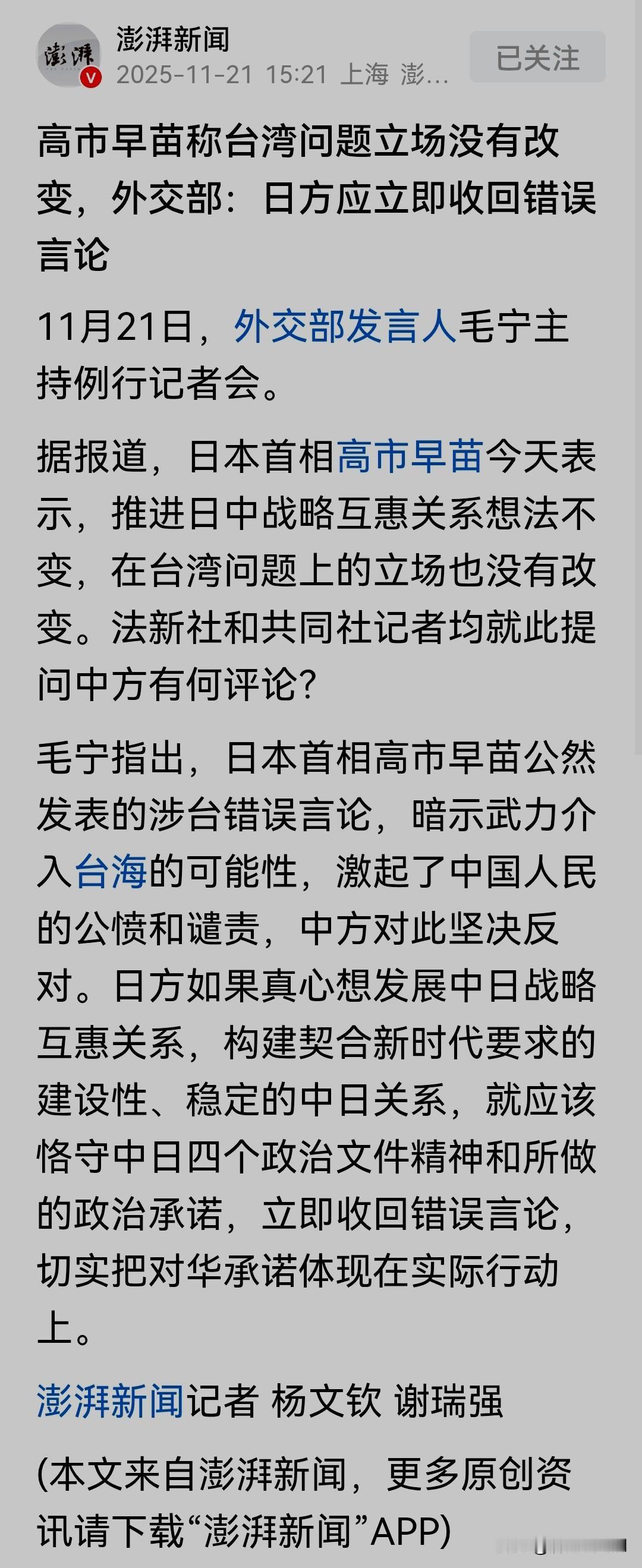 据报道,日本首相高市早苗11月21日表示,推进日中战略互惠关系想法不变,在台湾问题上的立场也没有改变。 高市早苗“两个”没有变,我们中国网友应该怎么办?希望我们中国网友:一方面应该坚持站在祖国的立场和观点,以不变应万变;另一方面应该始终听从祖国召唤,只要他们敢来犯,我们就让他们再体验一次八十年前的失败感!