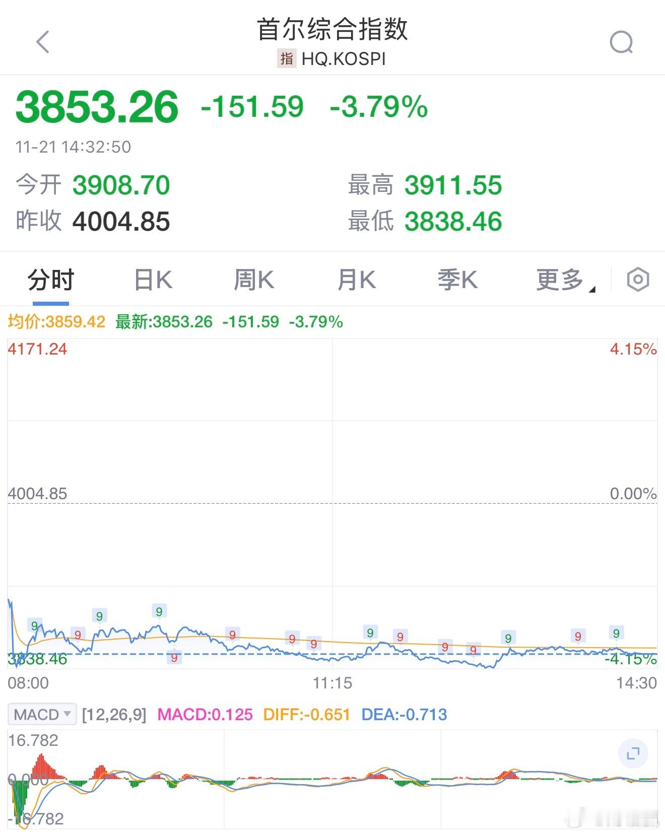 韩国KOSPI指数跌逾4%。