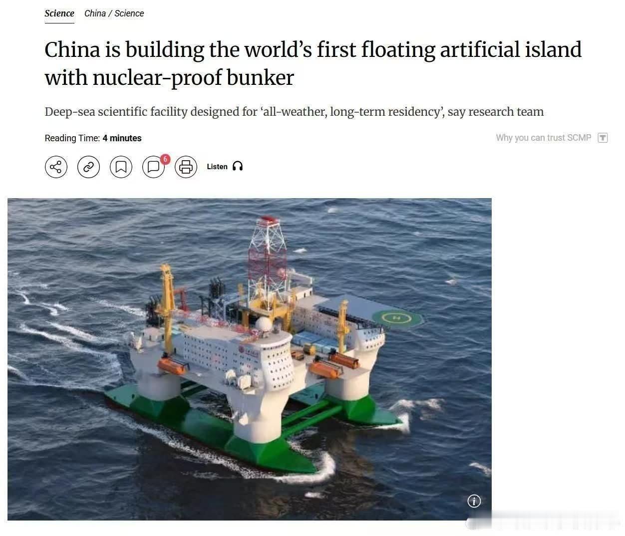 中国正在建造一座可在深海长期驻留、并能抵御核爆冲击的大型浮动科研平台。这座7.8万吨、双船体半潜式结构的平台被称为“深远海全天候驻留浮式研究设施”(简称“大科学设施”),可容纳238人连续驻留4个月,计划于2028年投入使用。