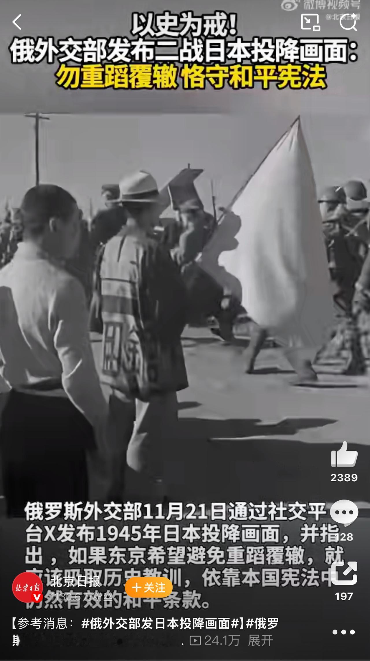 哈哈哈哈哈,俄罗斯外交部公布了日本二战投降的视频,还警告日本:勿重蹈覆辙,恪守和平宪法!这可真是一点面子都没给日本留啊! 难不成高市早苗这番发疯行径,本质就是想把日本经济拖入深渊,还让全世界不断回顾他们曾经犯下的罪行以及投降时的狼狈模样吗?[灵光一闪][灵光一闪][灵光一闪][捂脸][捂脸][捂脸][捂脸]
