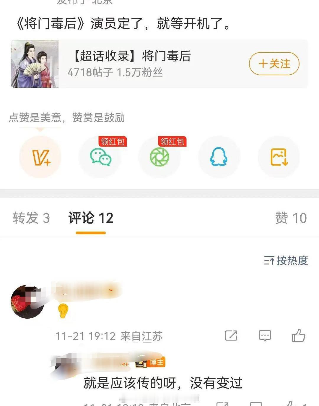 🍉主说《将门毒后》演员定了,就等开机了,就是网传阵容,没变过