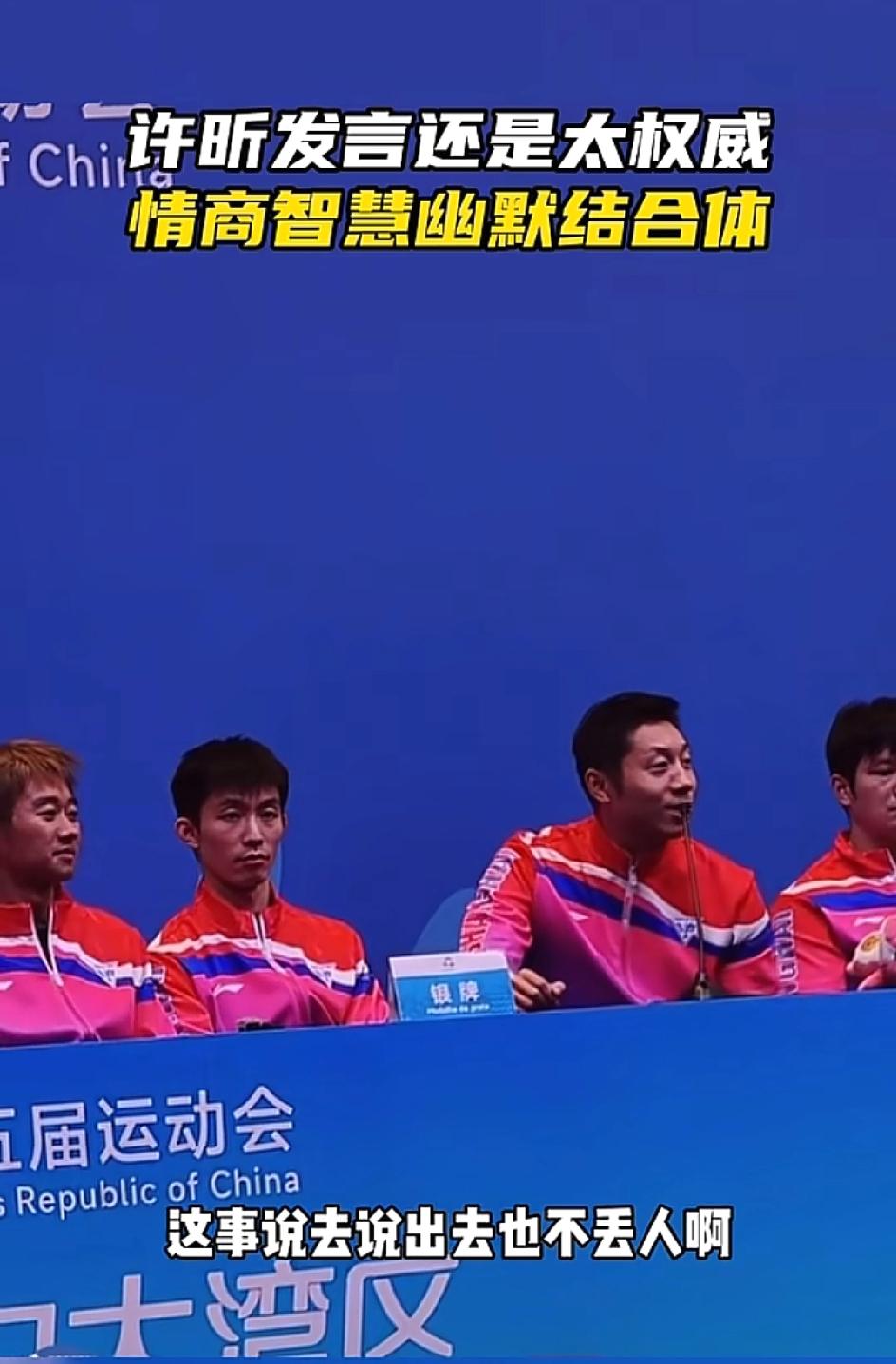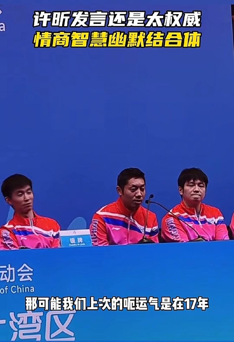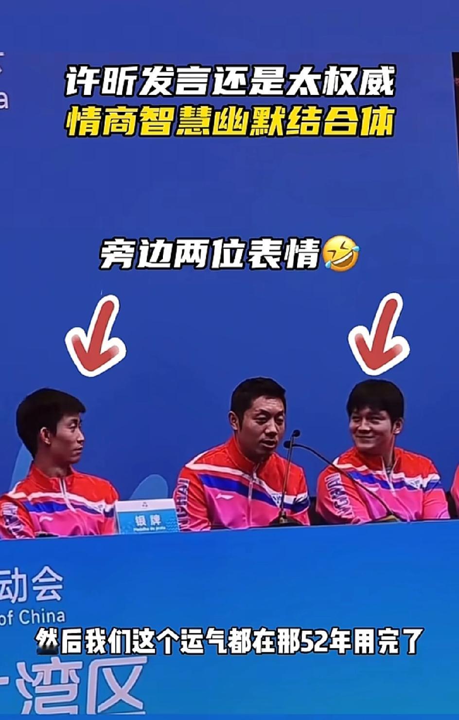 全运会赛后采访, 许昕的一番话直接逗笑了 坐在身旁一脸严肃的樊振东,东哥从严肃到忍不住,仅仅隔了几秒钟。 许昕一发言就开始整活,说他这个年纪应该没谁比他强了,但除了马龙,马龙比他大,这个得排除,哈哈,既夸了自己,又夸了龙队,这小嘴真会说。 接着话锋一转,说到失利,居然能归结到气运上,他说我们的运气在17年的时候就用完了,还得再积攒24年! 这话一出,樊振东再也憋不住了,笑了出来,不过笑着的樊振东还真的好看, 在竞技体育“成王败寇”的故事里,失利后的采访往往充斥着遗憾、自责与官方的总结。 但许昕却用了一种无厘头的表达方式,巧妙的化解了记者的提问,不得不说,许昕的回答跟他打球一样,不愧是“人民艺术家”,连回答都这么艺术! 总体而言,无论是许昕还是樊振东,他们都是这一代或者上一代的强者,也希望他们以后的路越走越好!