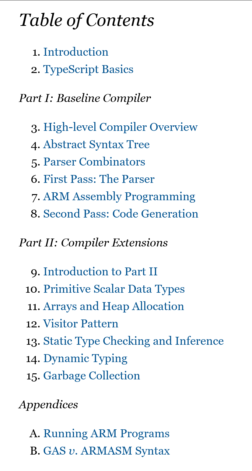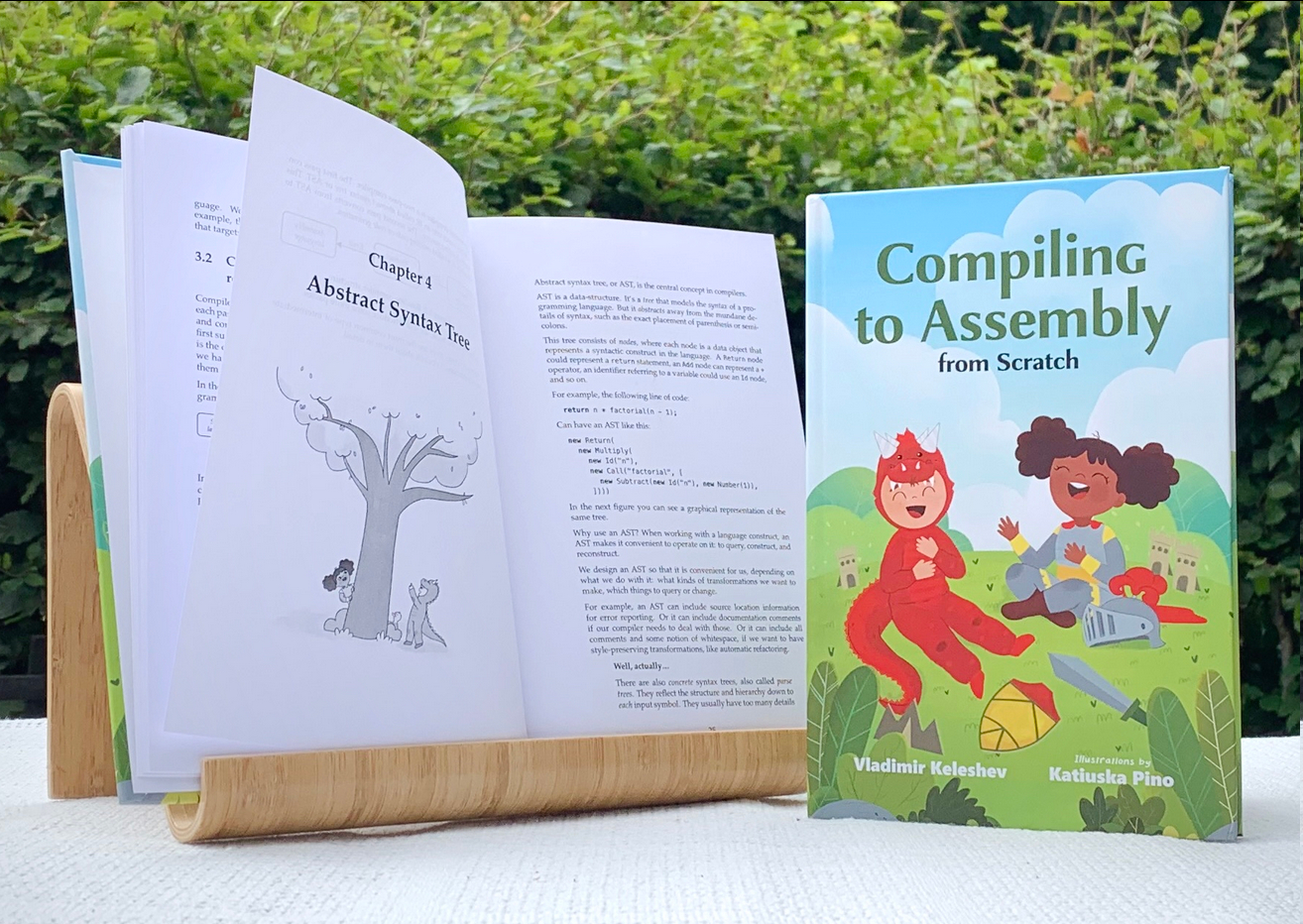 电子书 《Compiling to Assembly from Scratch》keleshev.com/compiling-to-assembly-from-scratch/一般帮助读者从零开始学习编译器和编程语言的工作原理的书,书中用的语言是TypeScript 。本书在线阅读免费。“欢迎来到编写自己编译器的奇妙旅程!拿起这本书时,你大概已经非常确定自己想要理解编译器是如何工作的,甚至可能想亲自写一个。尽管如此,下面是一些你应该动手做这件事的理由:✨编写编译器是理解计算机如何工作、如何执行我们的程序的最终步骤。✨通过编写一个小型编译器,你可以看到编译器其实也是程序,就像其他程序一样,并非神灵创造的魔法。✨通过理解汇编语言以及编译器如何将你的程序转化为汇编代码,你能更好地把握你编写程序的性能。✨它能让你更加清晰地看到不同语言特性之间的权衡,从而在何时使用它们以及如何有效使用它们时做出更明智的决策。✨学习解析技术将帮助你处理非结构化数据,如网页抓取,或应对没有现成库的数据格式。✨ 它还将为你在必要时制作自己特定领域的语言做准备,以应对手头的任务。✨它可能是进入编译器工程领域的第一步,这个领域既有前景又充满挑战。✨最后,它将让你体验到创造并实验自己编写的语言的乐趣和兴奋!编译器构建是计算机科学中研究最多的主题,其他任何主题都无法与之匹敌。因此,编译器文献中有大量有用的技术和算法。而且事实证明,其中很多内容在我们日常编程中非常实用。还有一种学派认为,最终,或许所有的程序都是编译器。也许我们并不是在编写 web 应用程序,而是在编写从 DOM 节点到 JSON,再从 JSON 到 SQL 的编译器,谁知道呢!”