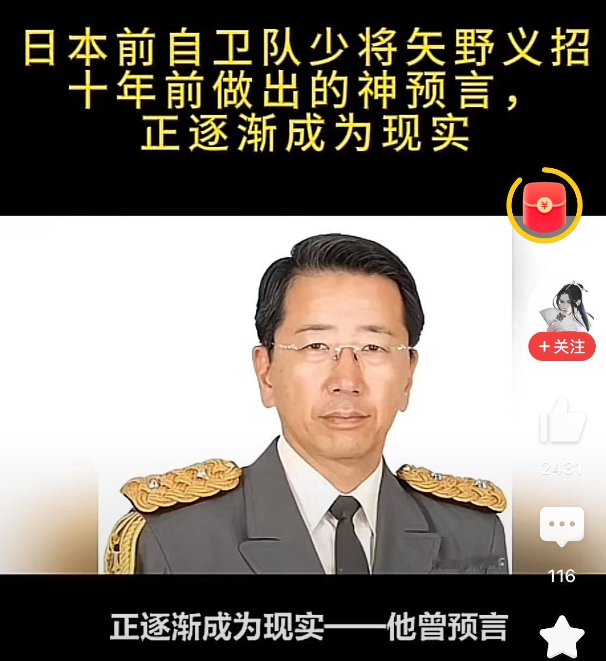 王仁三郎的预言又火了,他的预言准确率高达95%,他说2030年前日本灭国, 他曾经说中了: 1914年发生一战,战胜国有美国,战败国有德国;1923年关东大地震;日本会卷入二战,而且会被占领;广岛有灭顶之灾… 这家伙是祖传的神道师,他还说中了电视机,智能手机,互联网,时速700公里每小时的磁悬浮列车…… 前自卫队矢野义昭2012年也说过2025年中日会爆发战争,持续14天,中国占领冲绳为结束;这个人说中了俄乌冲突… 如果预言不可信,那么矢野义昭的推论确实有前瞻性。现在高市早苗已经把事情挑明,日本政府也说了这是日本的一贯态度,并且和解放军隔空秀肌肉,一点都不怂。 更让人担忧的是日本从小就教育孩子中国是最大的威胁,这些年在中国安插了很多间谍,很难分辨,很多人都身居要职。一旦开战我们防不胜防