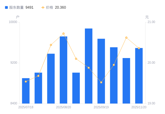 日期A股户数(户)流通A股户均持股数(股)户均持股市值(万元)2025-11-2094913345.276.812025-10-3192943416.187.042025-09-3095063340.006.662025-09-1996733282.336.412025-09-1098753215.196.392025-08-2990073525.047.092025-08-2097193266.806.772025-08-0893793385.226.922025-07-3190073525.046.942025-07-1888983568.226.97