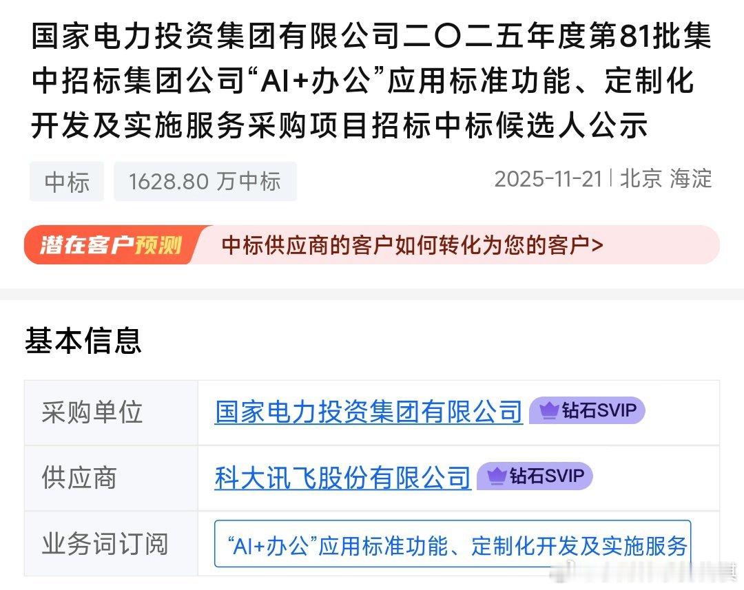 无聊_看看订单今日中标国家电力投资集团_AI+办公 金额1600万这一单很有意思,AI+办公场景大集团标准+定制沈阳住房公积金软件 金额2300万安徽中学 金额1600万其他小单800万一天合计:6300万中标人: 科大讯飞 讯飞智元第一单很有意思能源行业的“人工智能+”应用提供了可复制的标杆范例 与走势无关_纯娱乐_看产业信息
