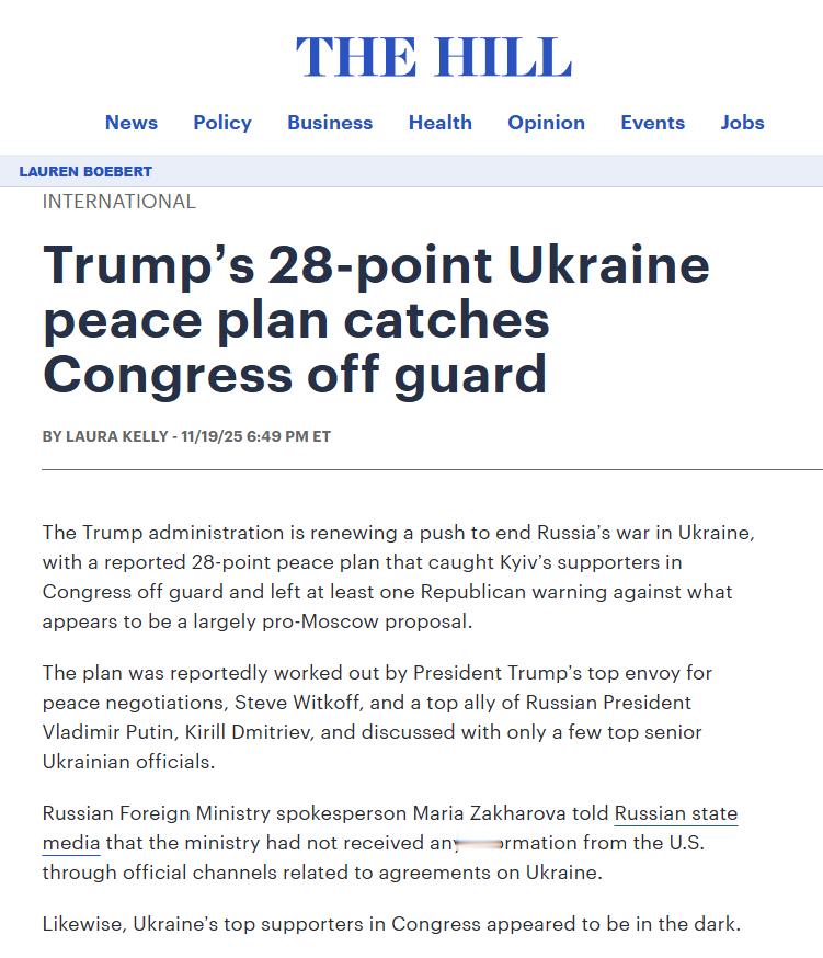 据《国会山报》报道,特朗普秘密提出的28项乌克兰计划令国会措手不及,他们主要从媒体获悉了细节。包括特朗普盟友林赛·格雷厄姆在内的两党议员都感到震惊,称该提案严重亲俄,且是在没有国会或乌克兰方面充分参与的情况下制定的。