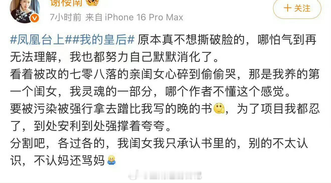 彭小苒和《凤凰台上》原著作者俩人好像吵起来了??包括了像东宫、女主人设、以及原著作者发言引起的争议。怎么说呢…她可能想表达尊重观众,也诚心接受所以建议和意见,但是呢,我觉得她活人属性不应该用在这里。就蛮尴尬,蛮跳脱,蛮扎眼的~第一次见剧播期间原著作者这么能说的有这精力,都去撕编剧好吗? ,,