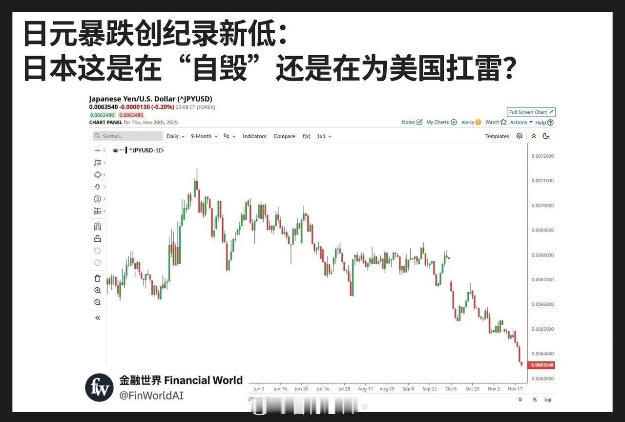 日元又崩了。图里这根直线式下坠,已经不是贬值,是自由落体。日元跌到0.0063,创下阶段新低,日本正把自己的货币往废纸方向推进。为什么日本要疯狂贬?因为它没有选择。通胀三十年压不住、利率抬不起来、债务压到天花板。但一旦加息,日本财政会被利息压力瞬间击穿,只能继续保持超低利率,任由日元被市场无情抛售。更讽刺的是,日本越弱,美元越强,美国越开心。全球资金抱美元,日本成了美债体系的稳定器甚至牺牲品。这波暴跌意味着:日本人资产购买力继续蒸发;企业成本飙升,但工资涨不动;游客狂刷日本打折季,本地人却越来越穷;美日经济关系更加不对等一句话,当一个发达国家把货币贬到发展中国家水平,它不是没看到悬崖,而是根本不知道哪里还有路可走。日元跌成这样,日本经济离摊牌不远了。
