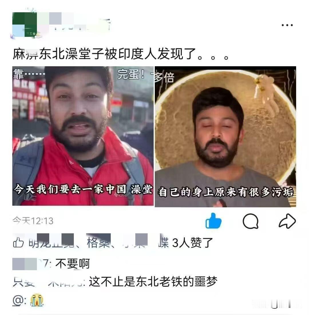 印度人组团来东北澡堂子搓澡,澡堂搓澡工和老板面临全所未有的“压力”! 一群印度组团来东北澡堂子,老板一开始喜笑颜开,连老外都知道咱东北澡堂子,一定要服务好他们! 搓澡工也摩拳擦掌,准备拿出毕生功力来伺候这群印度人,听说外国人大方,说不定能给一笔小费呢! 结果,这帮印度人来了,整个浴室瞬间成了灾难级现场,浴室不通气,满浴室咖喱味不说,这帮印度人还海吃海喝免费的零食,搓澡工搓了半天,每个印度人平均都是搓下一盆淤泥!浴池水也被搞的花花绿绿!搓澡时,他们眼睛还乱瞟,叽叽咕咕不知道在说什么!搞的人紧张不已! 临走时,这帮印度人拿出手机,好家伙,原来是团购的优惠券![捂脸]