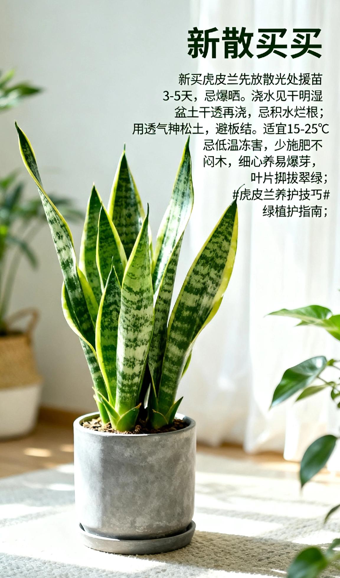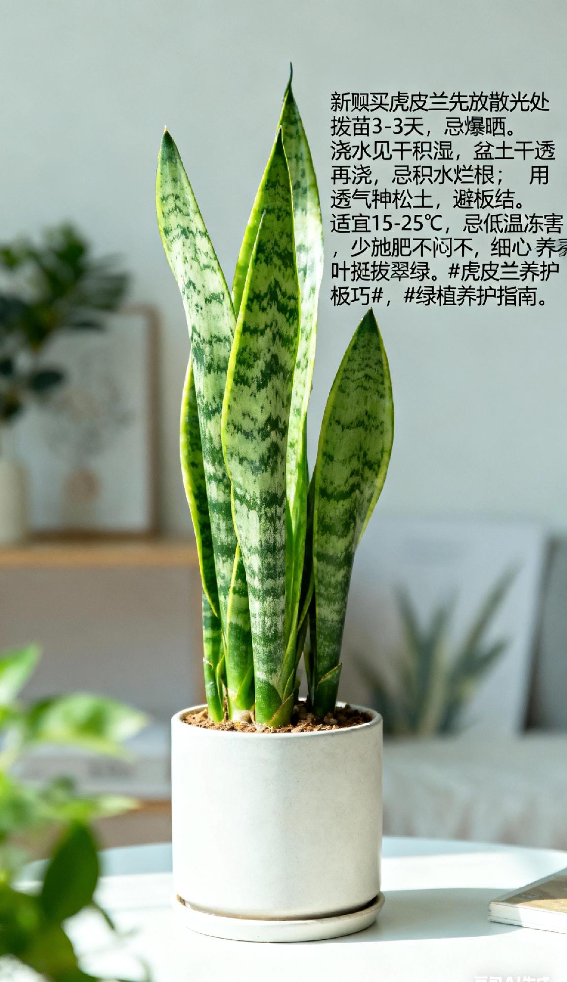 新买的虎皮兰怎么养护新买虎皮兰先放散光处缓苗3-5天,忌暴晒。浇水见干见湿,盆土干透再浇,忌积水烂根;用透气疏松土,避板结。适宜15-25℃,忌低温冻害,少施肥不闷根,细心养护易爆芽,叶片挺拔翠绿。虎皮兰养护技巧 绿植养护指南 金边虎皮兰