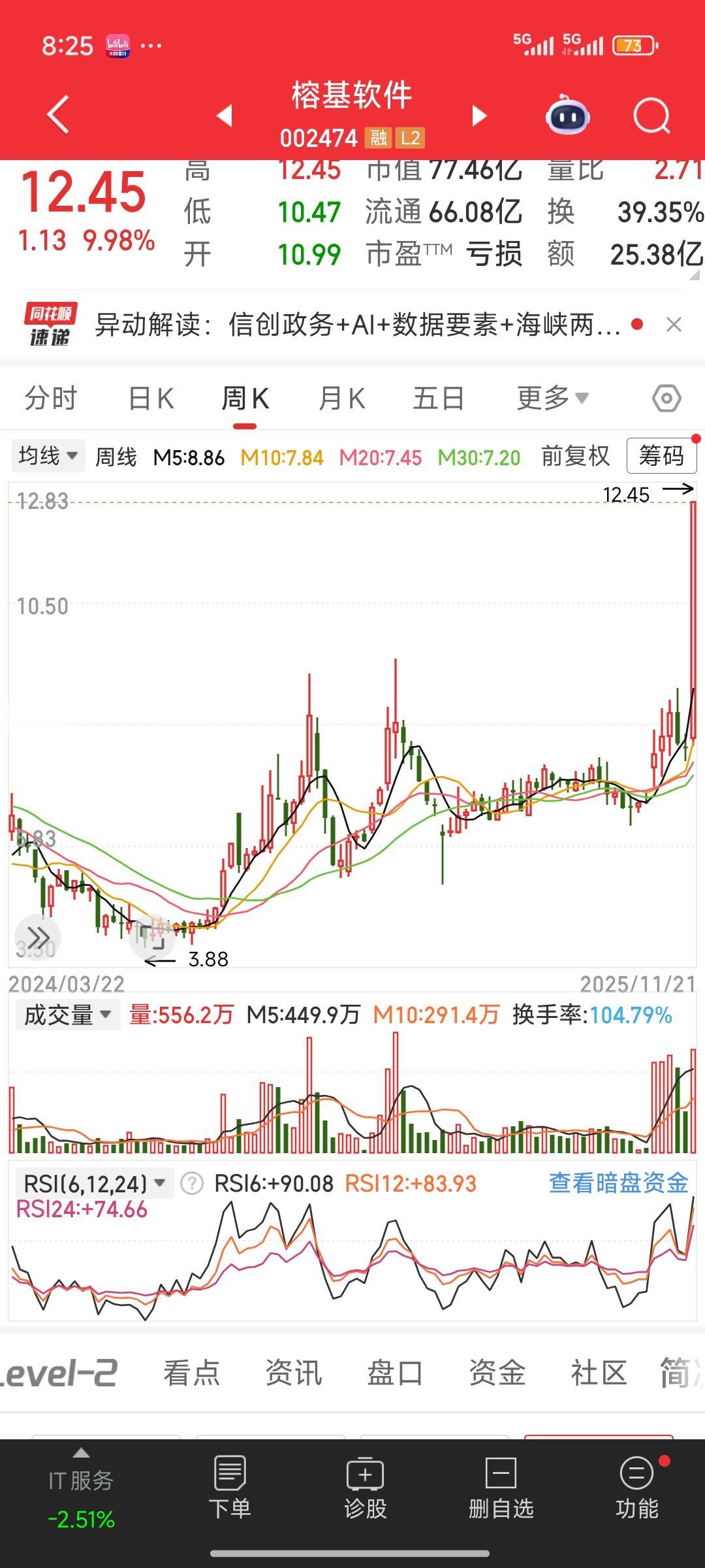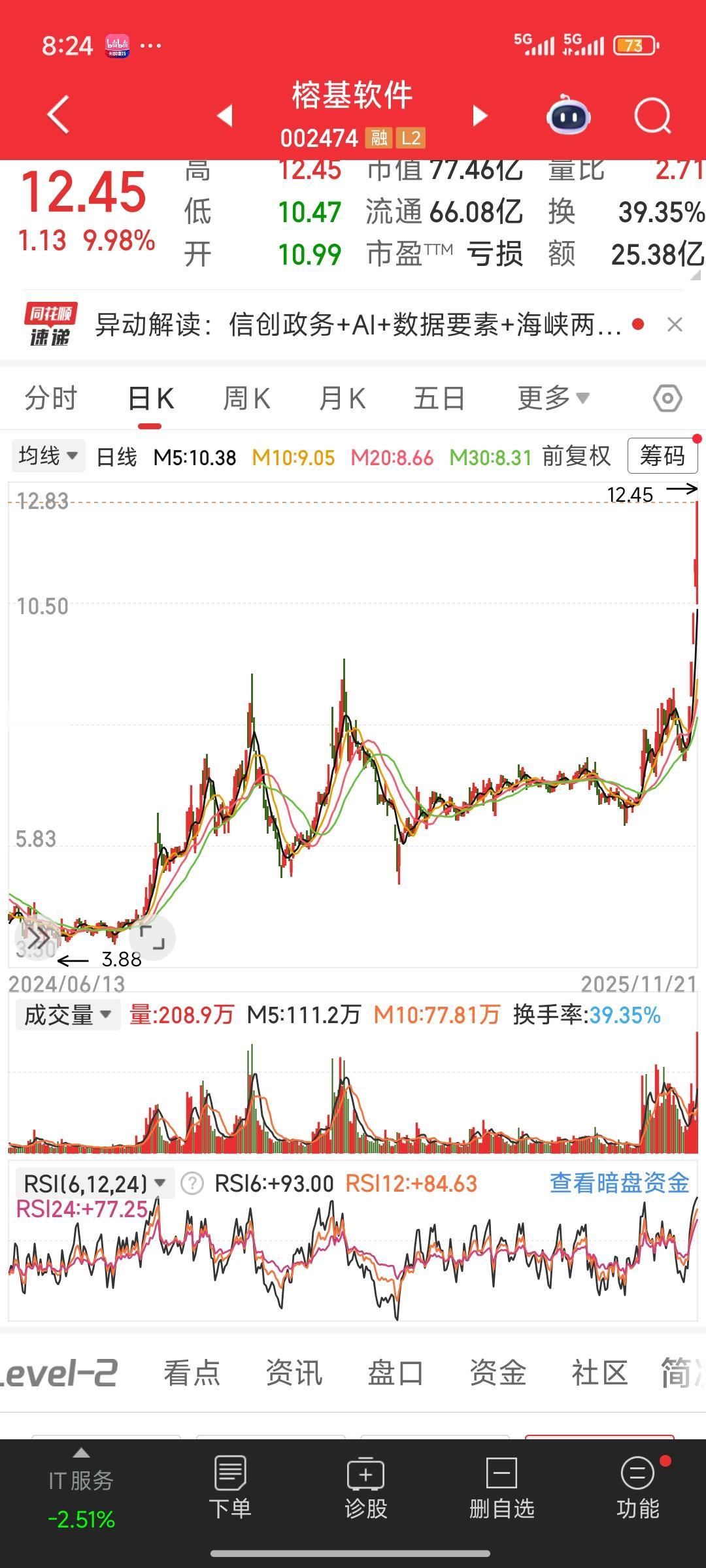 榕基软件最近真是牛得不行,K线图的走势堪称经典,必须留图纪念。11月20日9点30分就触及涨停板,价格到了10.29,涨幅达10.05%,当日VR&AR、传感器、华为产业链概念都跟着涨。11月19日主力资金净流入1138.87万元。 紧接着11月21日9点38分又触及涨停板,价格12.35,上涨9.1%。11月20日主力资金净流入更是达到1.03亿元。这连续的涨停表现,K线图肯定漂亮。不过股市变幻莫测,这经典走势之后是继续上扬还是回调,就看市场怎么表演了。 软件股 股票模型软件 榕树科技 上证软件 新希望软件 福州软件 榕创未来