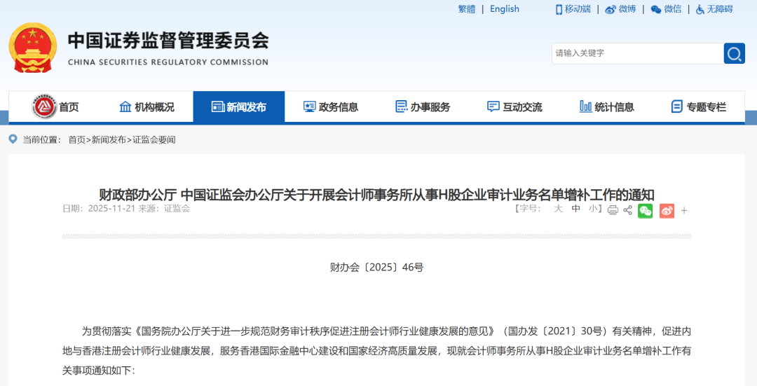 为贯彻落实《国务院办公厅关于进一步规范财务审计秩序促进注册会计师行业健康发展的意见》(国办发〔2021〕30号)有关精神,促进内地与香港注册会计师行业健康发展,服务香港国际金融中心建设和国家经济高质量发展,近日,财政部、中国证监会联合印发了《关于开展会计师事务所从事H股企业审计业务名单增补工作的通知》(财办会〔2025〕46号,以下简称《通知》)。《通知》规定了工作原则、申报要求、申请材料、工作程序和监管要求等。财政部、中国证监会有关部门负责人就《通知》有关问题回答了记者的提问。