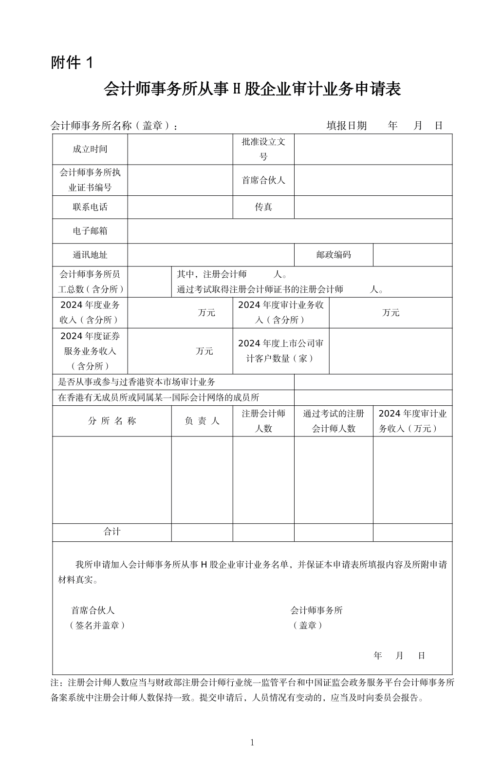 (一)会计师事务所从事H股企业审计业务申请书(含申请表,附件1);