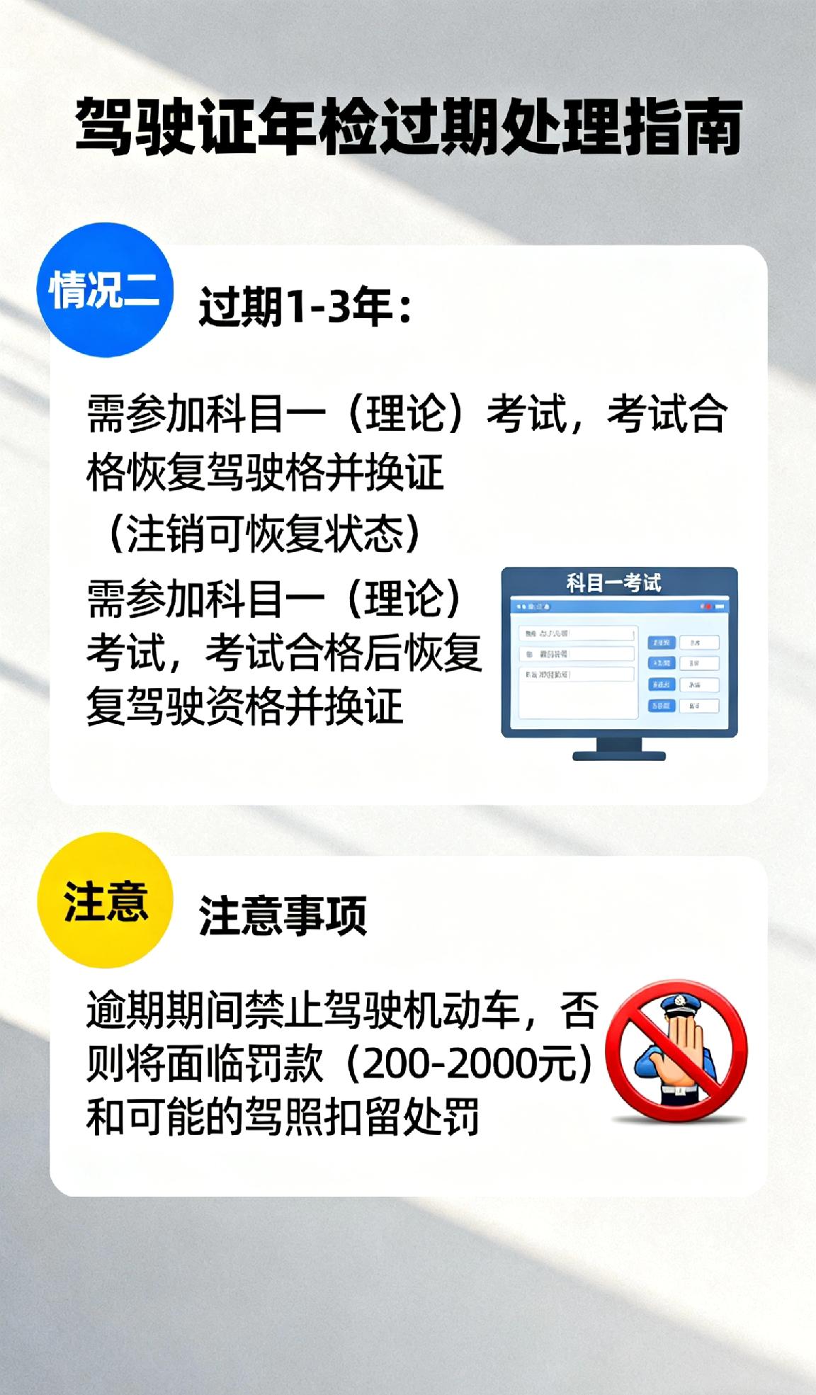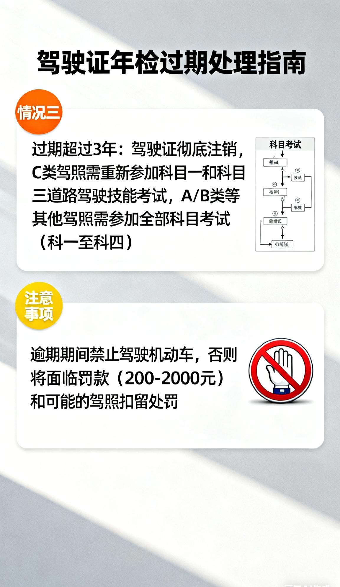 驾驶证年检过期是否需要重新考试取决于过期时间长短: - 过期未超过1年:无需考试,直接携带身份证、驾驶证和体检证明到车管所办理换证即可 - 过期1-3年:需参加科目一(理论)考试,考试合格后可恢复驾驶资格并换证,这属于"注销可恢复"状态 - 过期超过3年:驾驶证彻底注销,C类驾照需重新参加科目一和科目三道路驾驶技能考试;A/B类等其他驾照需参加全部科目考试(科一至科四) 注意:逾期期间禁止驾驶机动车,否则将面临罚款(200-2000元)和可能的驾照扣留处罚 总结:驾驶证年检过期不一定需要重新考试,短则直接换证,长则需考科目一,超三年才需重新考取驾照。