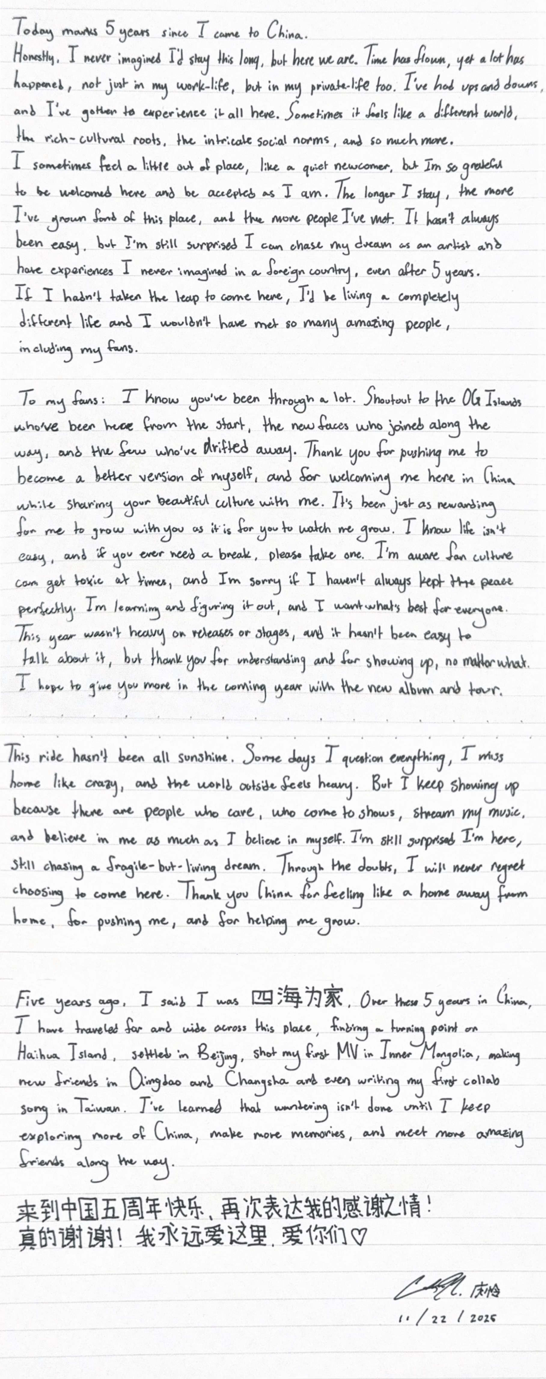 【】 在来到中国五周年之际, 分享了一封长长的手写信,回顾自己在这里的变化与成长:“在中国的这五年,我踏遍了这片土地的五湖四海——在海花岛迎来人生的重要转折,在北京扎根生活,在内蒙拍下了我的首支MV,在青岛和长沙遇见了一群珍贵的挚友,在台湾写下了我的第一首真正意义上的合作曲……原来漂泊的尽头,是这片土地予我的归属感,每座城都是家的模样。”信的最后,他用汉字写下:“来到中国五周年快乐,再次表达我的感谢之情!真的谢谢!我永远爱这里,爱你们❤”