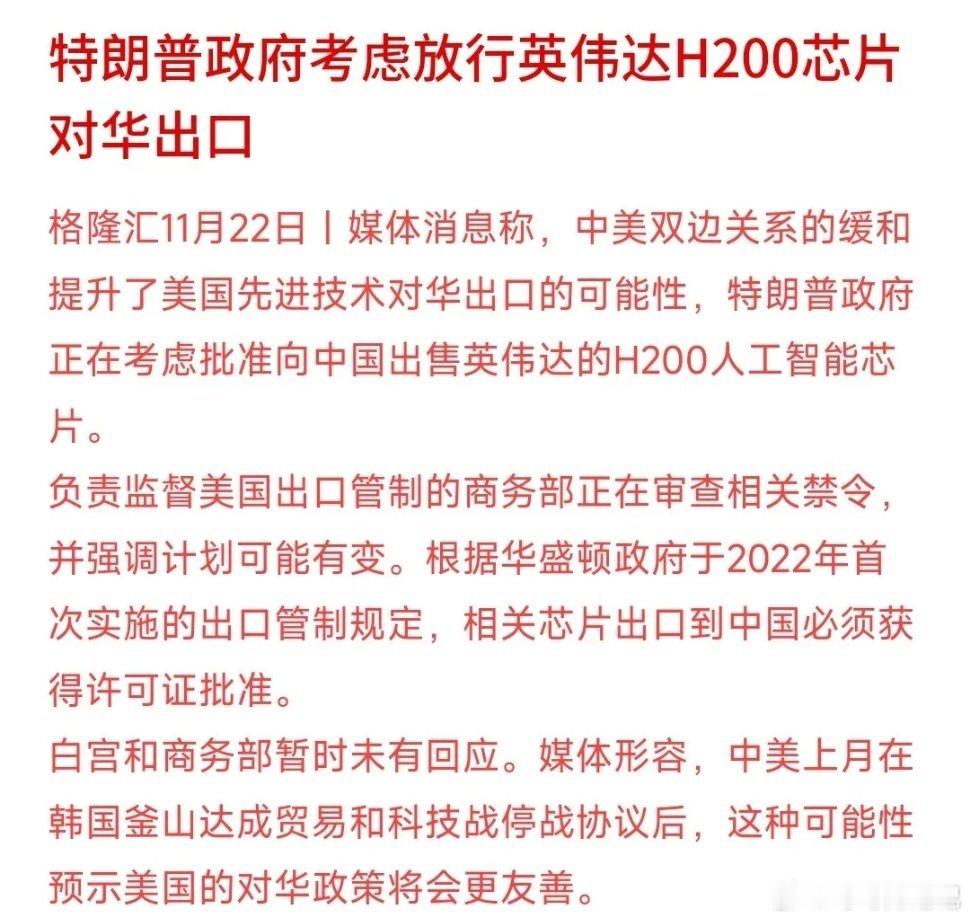 特朗普这是扛不住了,怕美股崩盘,连忙对华进行让步最新消息,特朗普正在考虑对华的出口限制,尤其是英伟达的H2000系列。特朗普的突然让步并不是临时起意,最近英伟达的股价从高点跌了11.66%,而纳斯达克指数也跌了6.52%。作为美国的经济命脉,特朗普显然也不想美股继续下跌,希望由英伟达再次引领美股三大指数由跌转涨。如果美股崩塌了,那就是特朗普的锅,中期选举将会造成无法挽回的后果,民意调查也会出现大幅跌落,这是特朗普不想看到的。所以不得不对英伟达的大客户中国做出妥协,希望以此稳住经济。