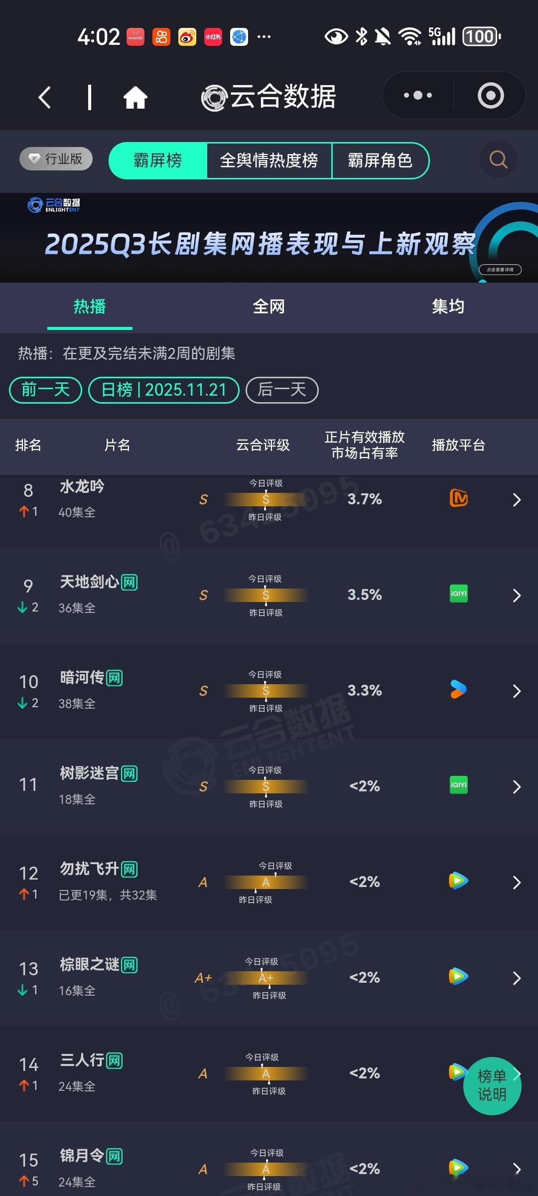 11月21日云合播放占比 唐朝诡事录之长安29.6%四喜17.2%可怕,占比17.2%,评级也还是S,这大盘是有多低。他为什么依然单身10%这剧播得好快啊。凤凰台上6.4%山河枕5.6%新闻女王5.4%银峰3.8%这是个啥剧啊水龙吟3.7%天地剑心3.5%暗河传3.3%唉,一串都是S A