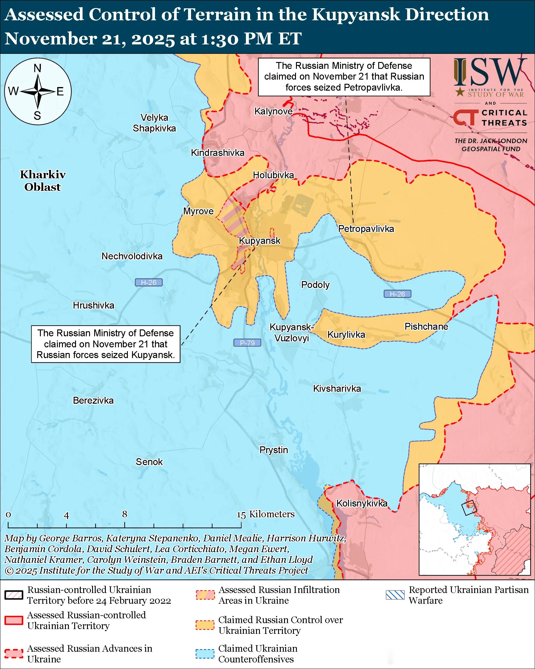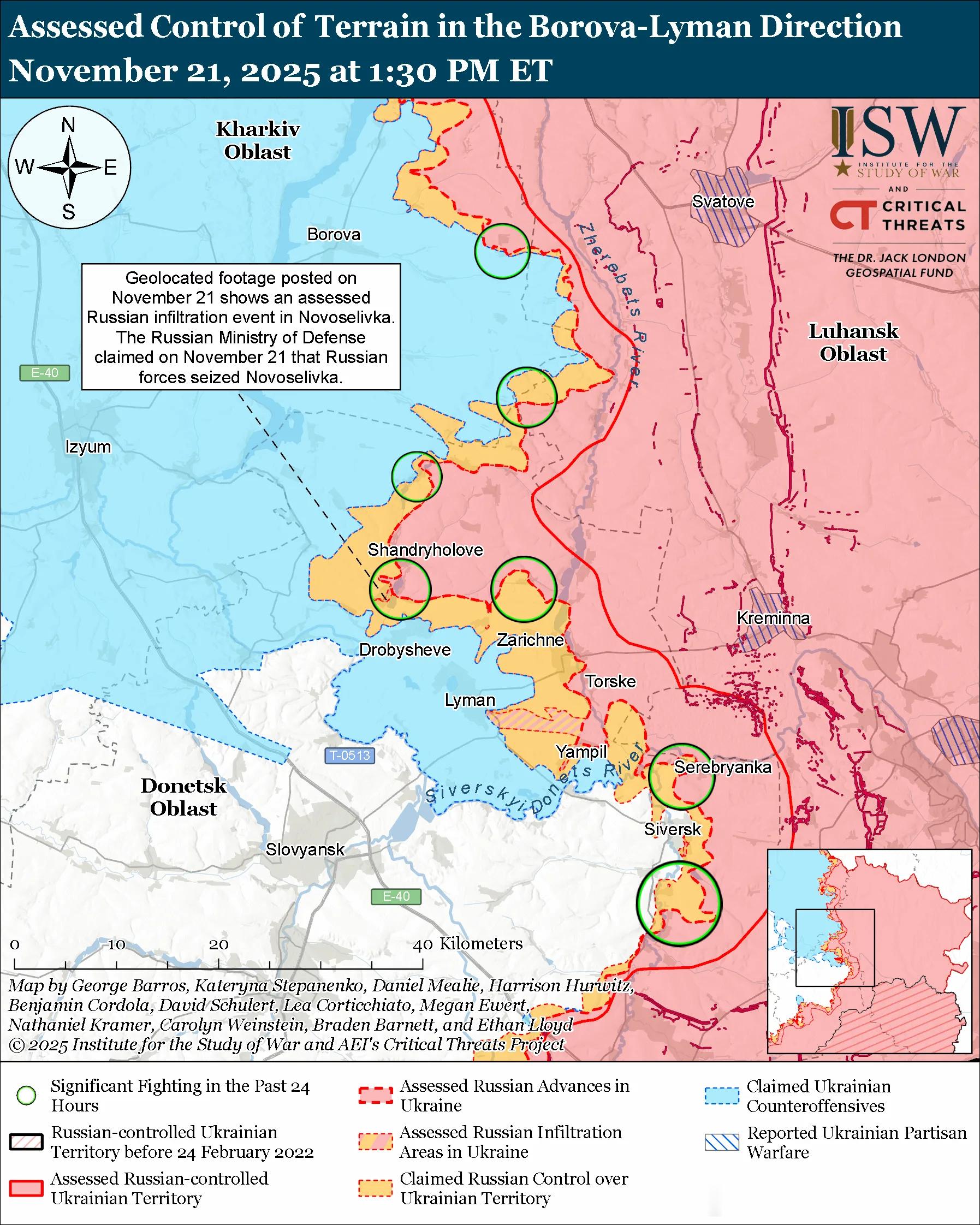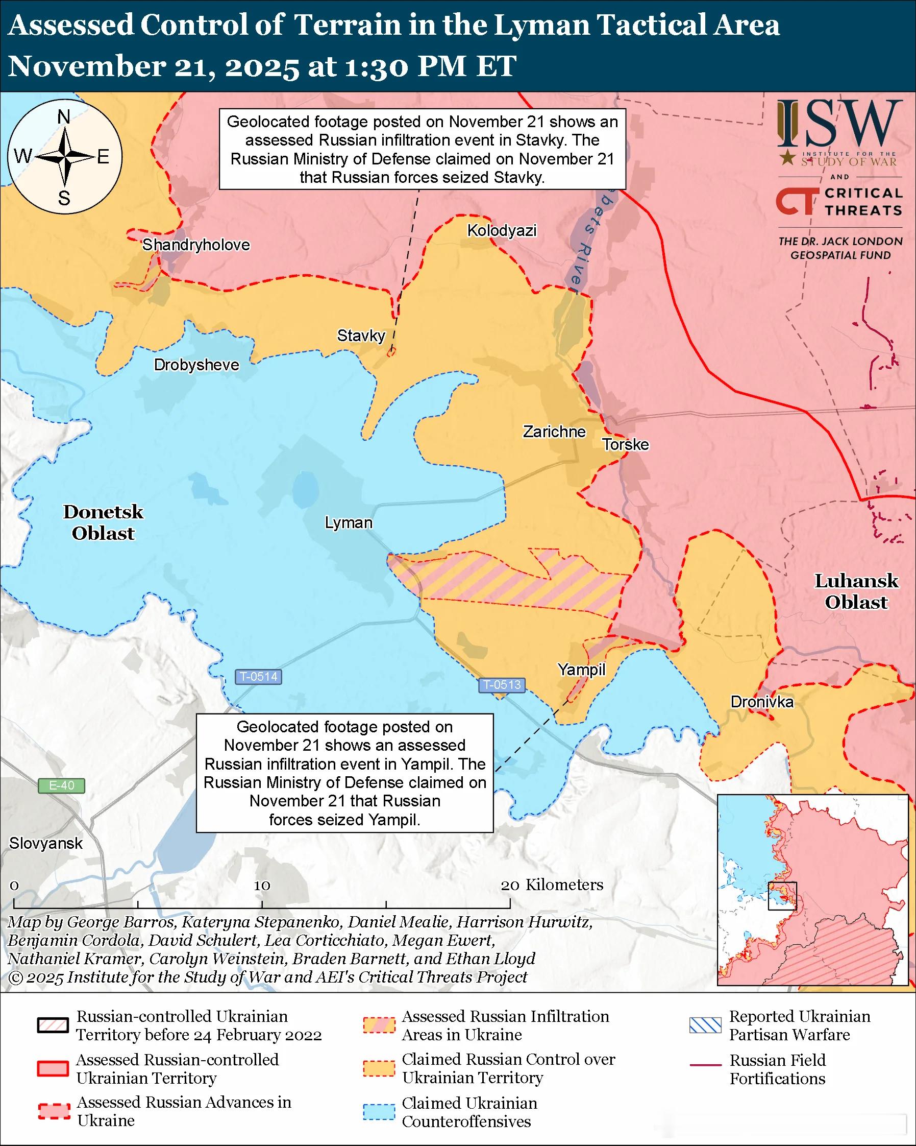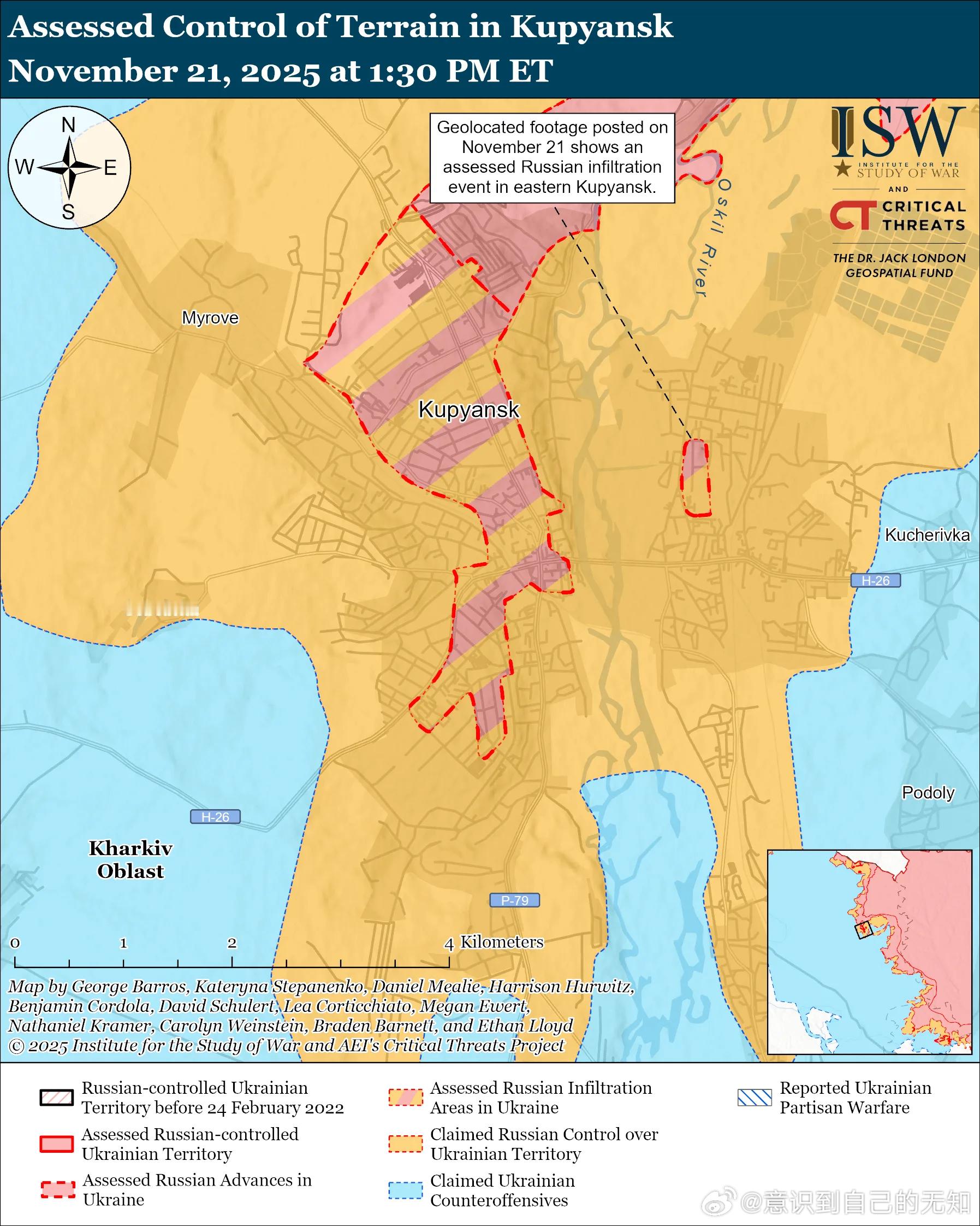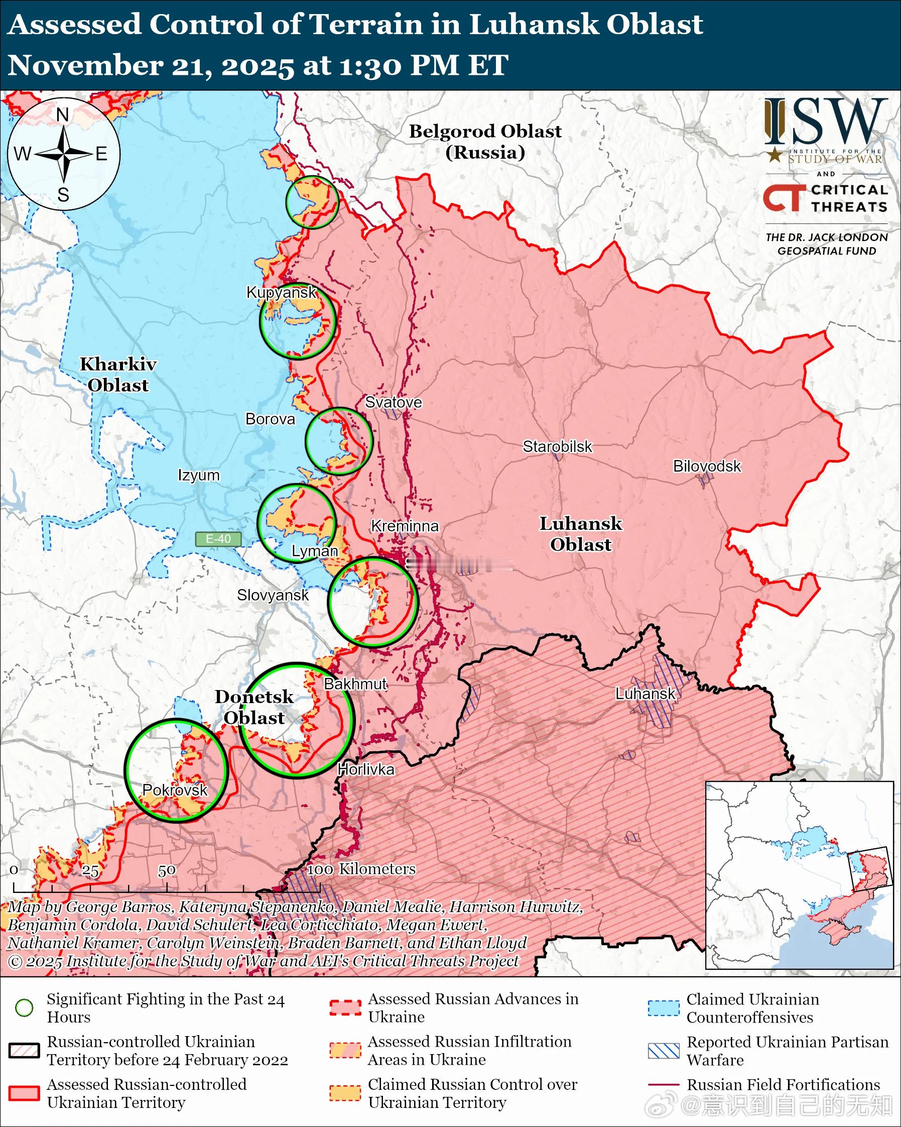 俄军主要行动2俄军目标:占领卢甘斯克州剩余部分,向西推进至哈尔科夫州东部,并包围顿涅茨克州北部。11月21日俄军继续向库皮扬斯克方向发起进攻,但并未取得确切进展。11月20日和21日,俄军从库皮扬斯克以东向彼得罗巴甫洛夫卡方向进攻,并向库皮扬斯克东南方向的库里利夫卡和皮什恰内附近进攻。俄罗斯军事博客作者声称,乌克兰军队在库皮扬斯克附近以及布拉霍达季夫卡(库皮扬斯克以西)和库特基夫卡(库皮扬斯克以北)进行了反击。11月20日在库皮扬斯克方向作战的乌军旅发言人报告称,俄军正试图使用车辆和摩托车穿越无人机“杀伤区”(该区域紧邻前线,大量战术打击和侦察无人机对任何进入该区域的装备或人员构成极高风险),并与乌克兰军队发生交火。该发言人表示,俄军正试图利用雾雨天气削弱乌克兰无人机的侦察和打击能力。发言人还报告称,俄军已减少在库皮扬斯克方向的滑翔炸弹空袭,增加炮击,并正在打击乌克兰的渡口。作战序列:据报道俄第47坦克师(近卫第1坦克集团军,莫斯科军区)第7独立侦察营和第51独立工兵营(据称隶属于近卫坦克集团军)的无人机操作员正在波多利(库皮扬斯克西南部)附近打击乌克兰部队。第27摩步旅(近卫坦克集团军)的(FPV)无人机操作员正在大沙普基夫卡(库皮扬斯克西北部)附近打击乌克兰部队。第68摩步师(第6合成集团军,列宁格勒军区)的(FPV)无人机操作员正在奥萨德基夫卡(库皮扬斯克西南部)附近打击乌克兰人员和装备。俄罗斯国防部称,第 27 摩步旅和第 1486 摩步团攻占了库皮扬斯克,第 121 摩步团(第 68 摩步师)攻占了彼得罗巴甫洛夫卡。11月21日俄军继续向博罗瓦方向发起进攻,但并未取得进展。11 月 20 日和 21 日,俄军从博罗瓦向东北方向进攻新普拉托尼夫卡;从博罗瓦向东进攻科潘基附近和希基夫卡;从博罗瓦向东南方向进攻赫雷基夫卡和新霍里夫卡。俄罗斯媒体“动员新闻”发布了一段据称是俄第15摩步团第4营第10连(第2摩步师,MMD)一名士兵拍摄的视频,该士兵称,在克鲁利亚基夫卡(博罗瓦东北部)作战的部队缺乏补给,而且指挥官经常虐待下属并敲诈士兵。11月21日俄军继续在斯拉维扬斯克-利曼方向发动进攻,但并未取得确切进展。未经证实的说法:俄罗斯国防部和俄罗斯军事博客声称,俄军占领了扬皮尔,并向该定居点的西、南、北推进。然而另一位俄罗斯军事博客驳斥了俄军占领扬皮尔的说法。一位俄罗斯军事博客声称,俄军向新谢利夫卡以南推进。11月20日和21日,俄军在莱曼西北部的德罗比舍韦、尚德里霍洛韦、科罗维亚尔、奥列克桑德里夫卡和新谢利夫卡附近,在莱曼北部的新米尔、卡尔皮夫卡和斯塔夫基附近,以及在莱曼东北部的科洛迪亚齐和斯塔夫基附近发动了进攻。一位俄罗斯军事博客作者声称,乌克兰军队在科罗维亚尔、奥列克桑德里夫卡和亚罗瓦(莱曼西北部)附近进行了反击。乌克兰第 11 军(AC)发言人德米特罗·扎波罗热茨中校于 11 月 21 日报告称,由于损失惨重,俄军不再直接进攻扬皮尔,而是转而尝试从北部绕过扬皮尔,向莱曼方向推进。扎波罗热茨指出,俄军正利用恶劣天气条件降低乌克兰无人机的效能,使用热隐形装置秘密推进。据称与俄北方集团军有关联的一位军事博主声称,俄第67摩步师(中央军区第25集团军)的指挥官能力不足,并且该师下属的第36和第37摩步团在夺取托尔斯克(莱曼以东)期间,因友军误伤造成的损失比乌克兰军队造成的损失还要多。该军事博主还补充说,虽然这两个团的战斗力都很强,但相互协调却几乎不存在。作战序列:据报道俄第164摩步旅(中央军区第25集团军)的无人机操作员正在莱曼方向打击乌克兰阵地。第3摩步师(中央军区第20集团军)正在新谢利夫卡作战。俄罗斯国防部长安德烈·别洛乌索夫称赞第169摩步旅(中央军区第25集团军)夺取了扬皮尔;第252摩步团(中央军区第20集团军第3摩步师)夺取了新谢利夫卡;第254摩步团(中央军区第20集团军第144摩步师)夺取了斯塔夫基。乌克兰军事情报总局(GUR)11月21日报告称,乌克兰军队和乌克兰游击队在被占领的卢甘斯克州卡利诺韦消灭了四名俄军和一些装备。