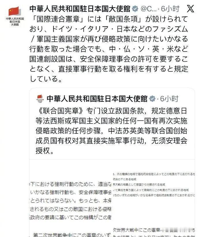 霸气!中国今霸气宣布对日本军事打击权是联合国天然授权! 今天(21日)下午,中国驻日大使馆今天在国际社交媒体平台X上公开用中日双语发帖称,中国有权军事打击实施侵略政策的日本。 这一罕见的外交表态,为何选择在此时公之于众? 答案或许藏在日本近期的一系列动作中:国防预算连续11年增长至GDP的2%,《国家安全保障战略》明确写入"对敌基地攻击能力",与美国在琉球群岛频繁开展联合军演。 消息传出后,东南亚国家的反应尤为强烈。 许多曾经饱受日本侵略之害的国家——新加坡、马来西亚、缅甸等——的主流媒体纷纷发表评论,支持中国依据国际法捍卫地区安全的立场。 中国网友的评论区瞬间沸腾。 "终于等到这一天!"类似的留言刷屏社交平台,人们用"扬眉吐气"形容此刻的心情。 这份声明的核心依据,来自《联合国宪章》中尘封已久的"敌国条款"。 该条款明确规定,对于日本等法西斯战败国,若其再次出现侵略苗头,中法苏英美等创始成员国可直接采取军事行动,无需安理会授权。 这不是简单的外交辞令升级,而是对历史法律文件的重新激活。 就像一把沉睡的正义之剑,在地区安全局势紧张的当下,被中国正式握在了手中。 为何选择社交媒体作为发声渠道? 中国外交官显然深谙现代传播规律——通过X平台直接发声,既能绕开传统媒体的过滤,又能实现中日双语的精准触达。 国际舆论场迅速形成鲜明对比:支持方强调"历史正义必须捍卫",质疑者则担忧"地区局势升级"。 但无论争议如何,中国已经成功将"日本军国主义复活风险"这一议题推上全球议事日程。 这份声明的分量,不仅在于其内容的强硬,更在于其背后的法律支撑。 当西方动辄援引"基于规则的国际秩序"时,中国正用联合国宪章的原始条款,构建属于自己的话语体系。 国内民众的强烈共鸣,源于积压已久的历史情绪。 从教科书篡改到靖国神社参拜,日本在历史问题上的暧昧态度,始终是横亘在两国关系间的巨石。 现在,中国用法律武器击碎了这层暧昧——不是情绪宣泄,而是依据国际法赋予的权利作出严正警告。 这种"有理有据的霸气",让无数国人感到前所未有的安心。 外交舞台正在发生深刻变革。 当传统外交还在依赖照会与公报时,中国已经将社交媒体变成了国际博弈的新战场。 这究竟是维护和平的"安全阀",还是点燃对抗的"导火索"? 答案或许取决于日本接下来的选择:是正视历史教训,还是继续沿着军事扩张的老路前行。 但有一点毋庸置疑:中国已经用行动证明,任何试图挑战战后国际秩序的行为,都将面临来自历史正义与国际法的双重反制。