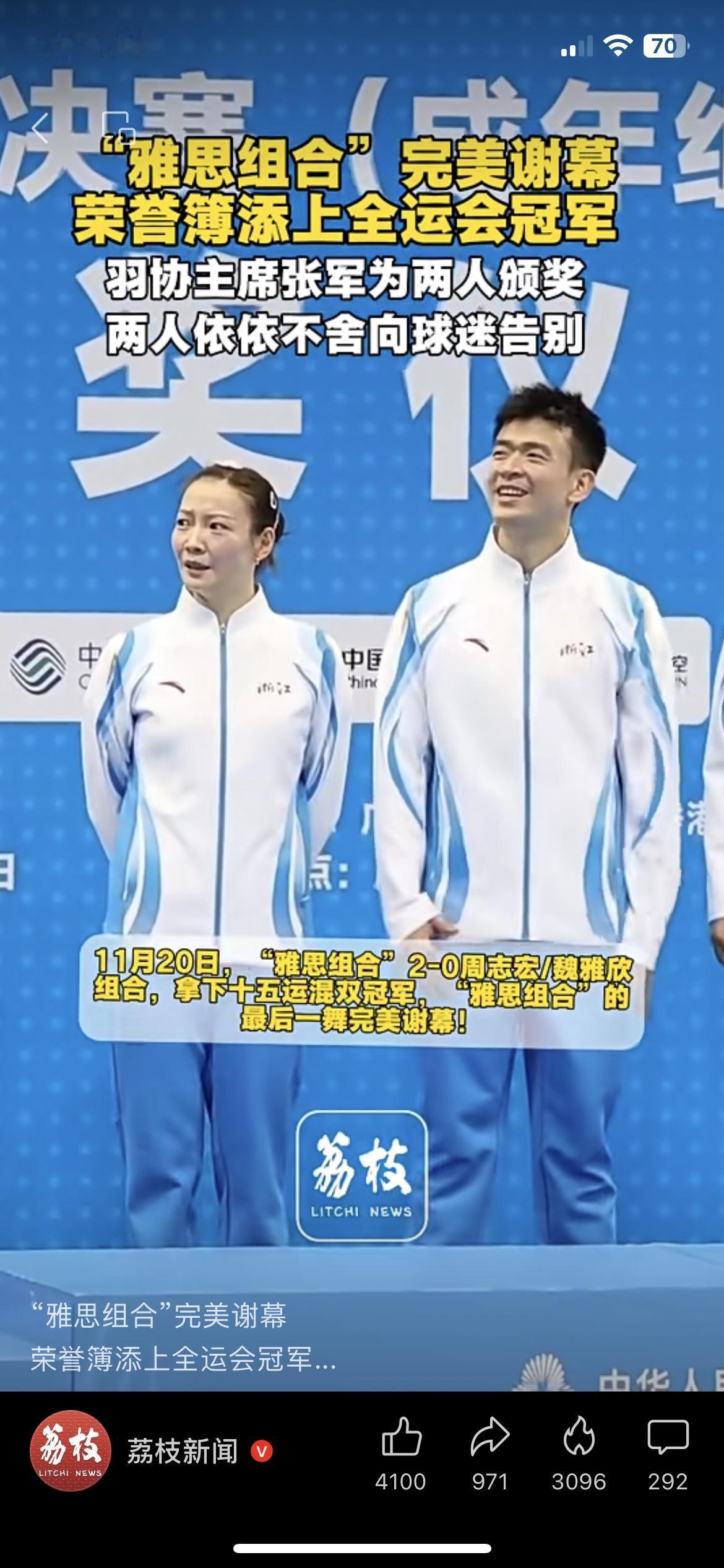 泪目!雅思组合全运会夺冠完美谢幕,这对羽坛传奇谁能不爱? 羽坛粉今天集体破防!郑思维和黄雅琼在全运会羽毛球混双决赛里,2∶0干脆利落地战胜对手,拿了金牌的同时,也打完了职业生涯最后一场比赛。他们俩搭档这么多年,拿下过无数世界冠军,每一场对决都看得人热血沸腾,默契程度简直无人能及。你心中他们最经典的比赛是哪一场?评论区聊聊你的回忆! 雅思组合完美谢幕 全运会羽毛球 羽坛传奇混双奥运冠军 雅思冠军