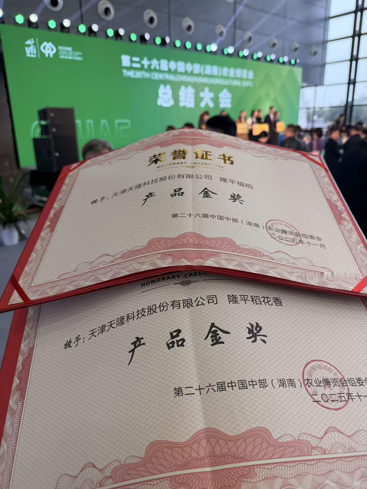 天隆科技稻花香6号,小站香1号荣获第二十六届中国中部湖南农业博览会双金奖!