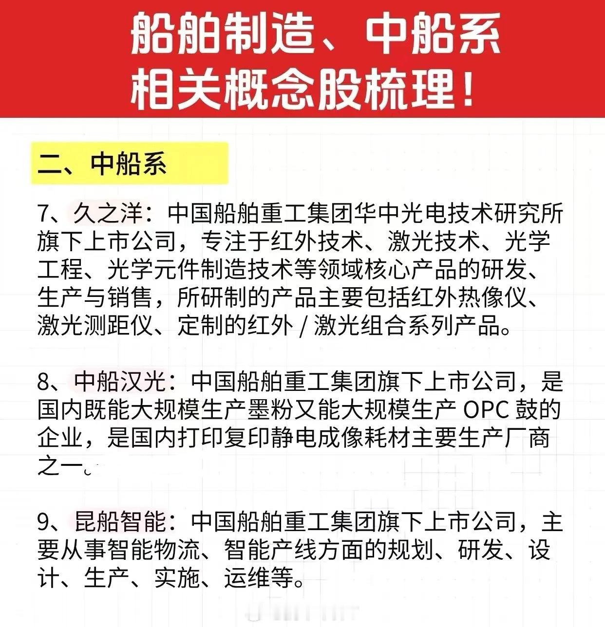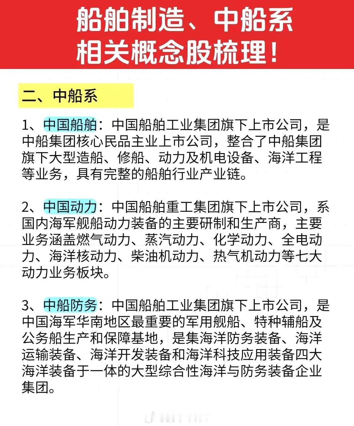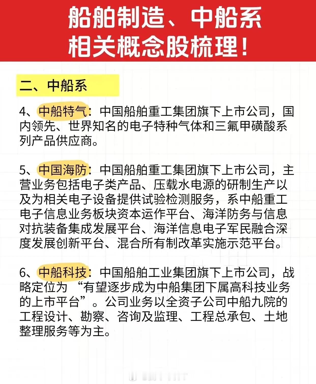 军工中船系相关概念梳理周末央企重组整合概念迎来利好,11月21日国Z委组织召开央企专业化整合推进会并举行重点项目签约仪式,中船系兼具央企重组概念和军工概念值得重点关注。中船科技:中国船舶工业集团有限公司旗下的核心企业之一,深海装备、风电装备领域的双龙头。中船汉光:公司掌握核心军工技术,是国内打印复印静电成像耗材领域的国产替代龙头。中国海防:国内少数几家具备完全自主知识产权军码北斗芯片的研制单位之一。理财有风险入市需谨慎,资料取材网络仅供参考!