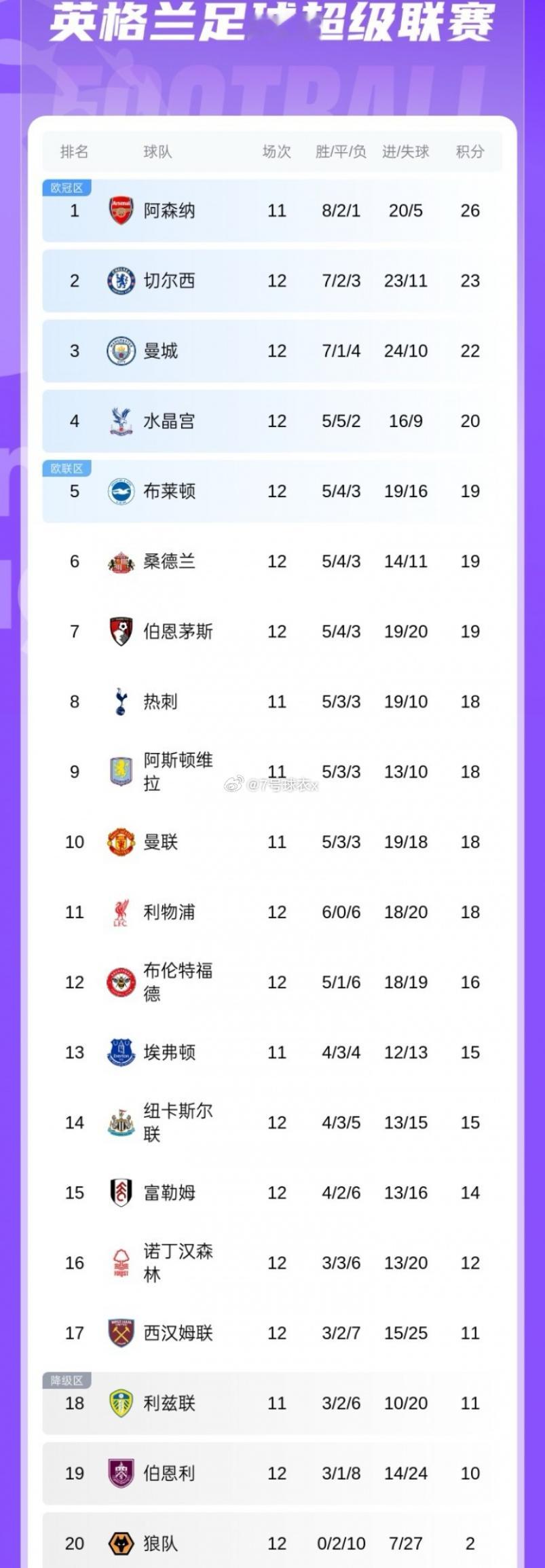 英超第12轮,曼城1-2不敌纽卡。最新积分榜方面,阿森纳少赛一场,3分优势领跑积分榜,若本轮在对阵热刺的德比大战中获胜,枪手的领先优势将扩大到6分。数据机构Opta的大数据预测再度进行更新,目前英超各队的夺冠概率:阿森纳夺冠概率升至70.18%,曼城18.11%;利物浦4.22%,切尔西3.47%。该榜单的第5名为1.44%的维拉,其余球队夺冠概率均不足1%。英超最新积分榜↓