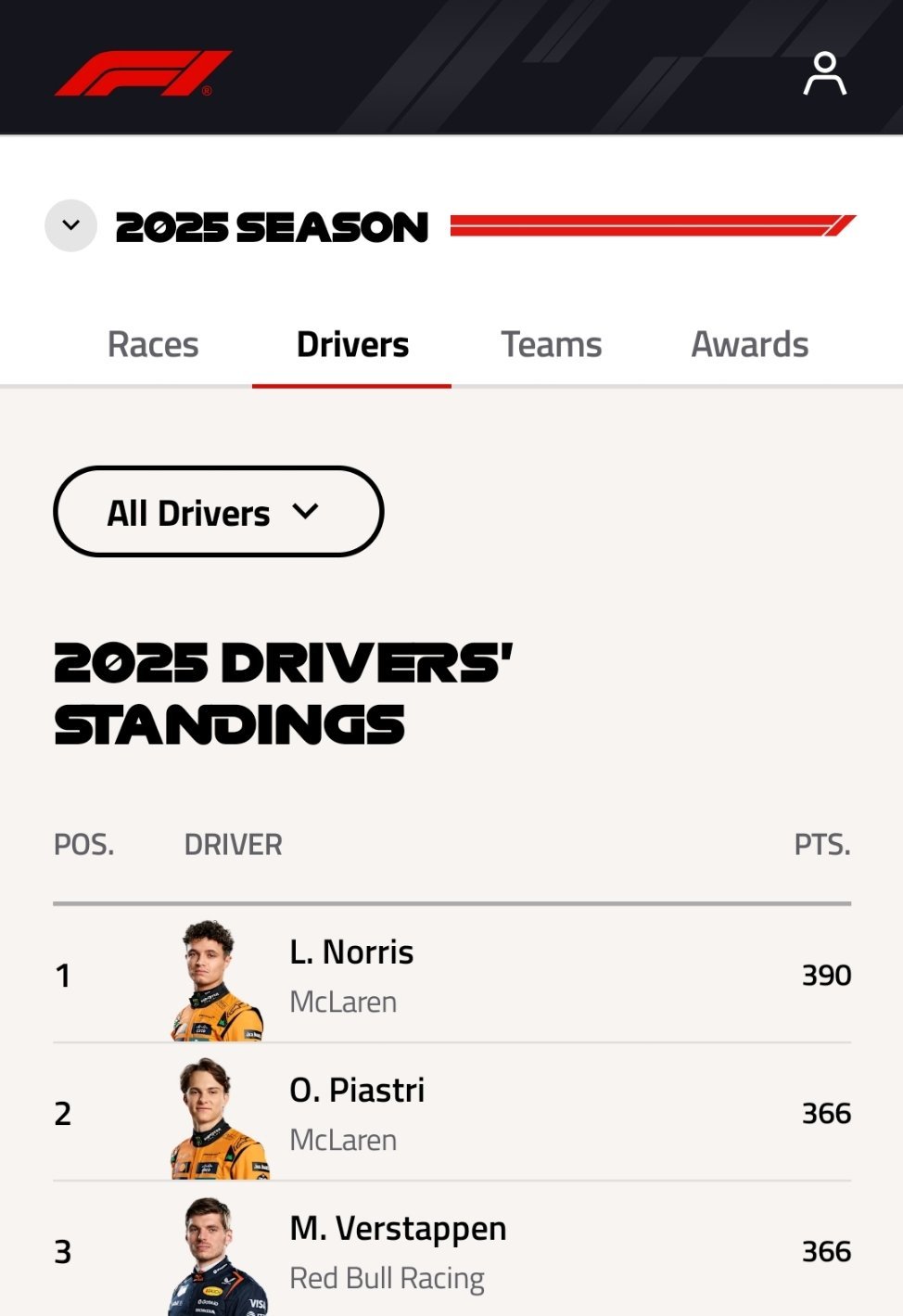 F1官方的APP提前确认 迈凯伦车队被双车DSQ 诺里斯和皮亚斯特里被取消正赛成绩!车手积分榜变成:诺里斯390分 皮亚斯特里和维斯塔潘是366分