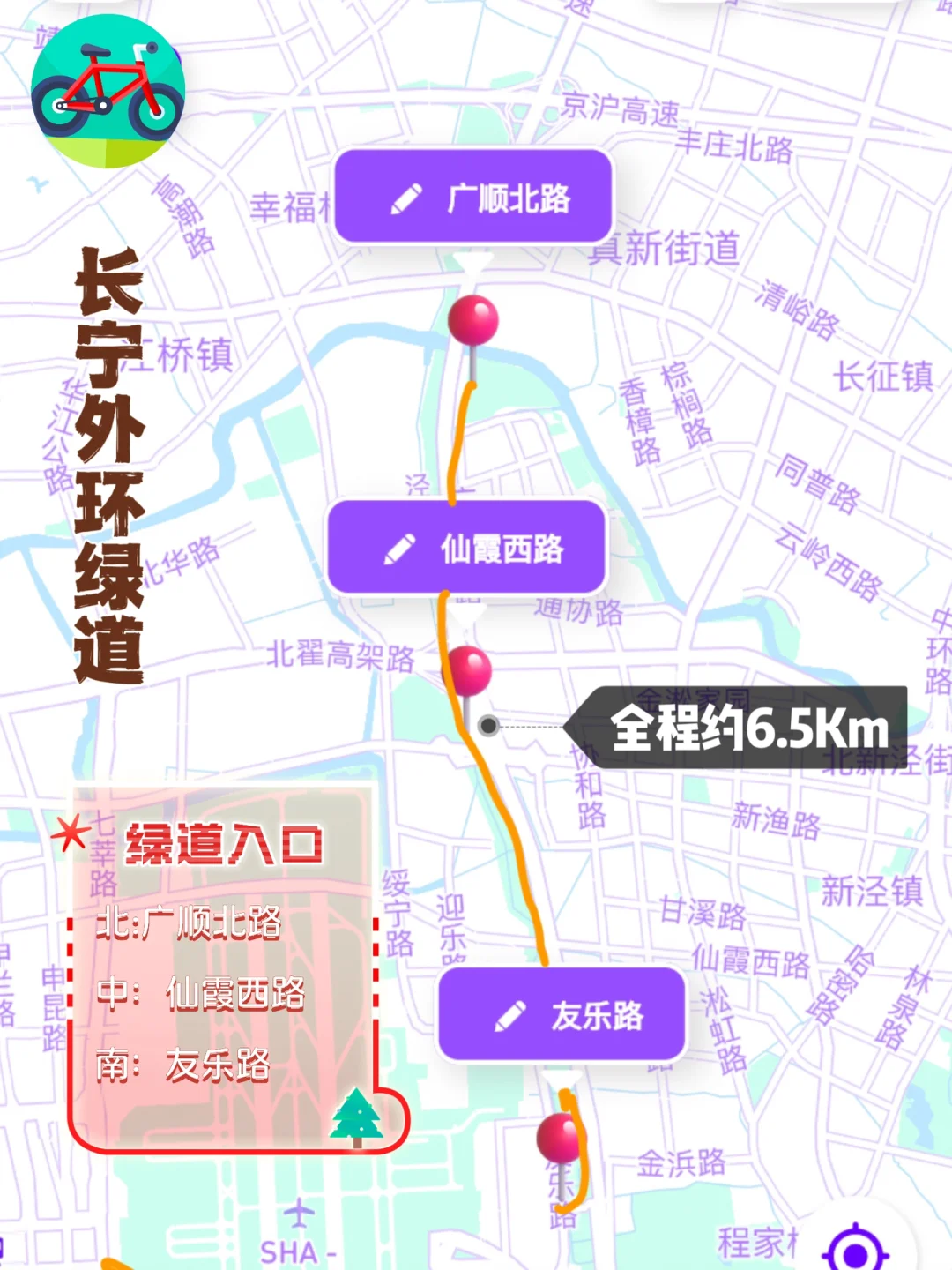 🚴路线:沿外环高速南北走向,途径北翟高架、虹桥体育公园