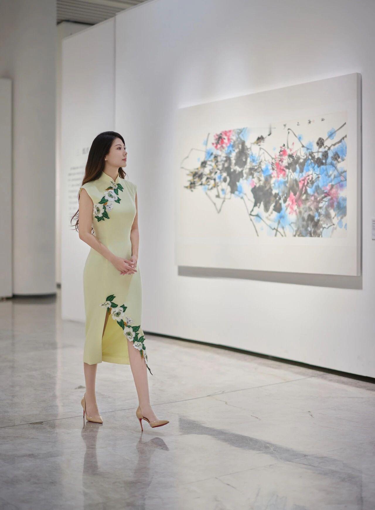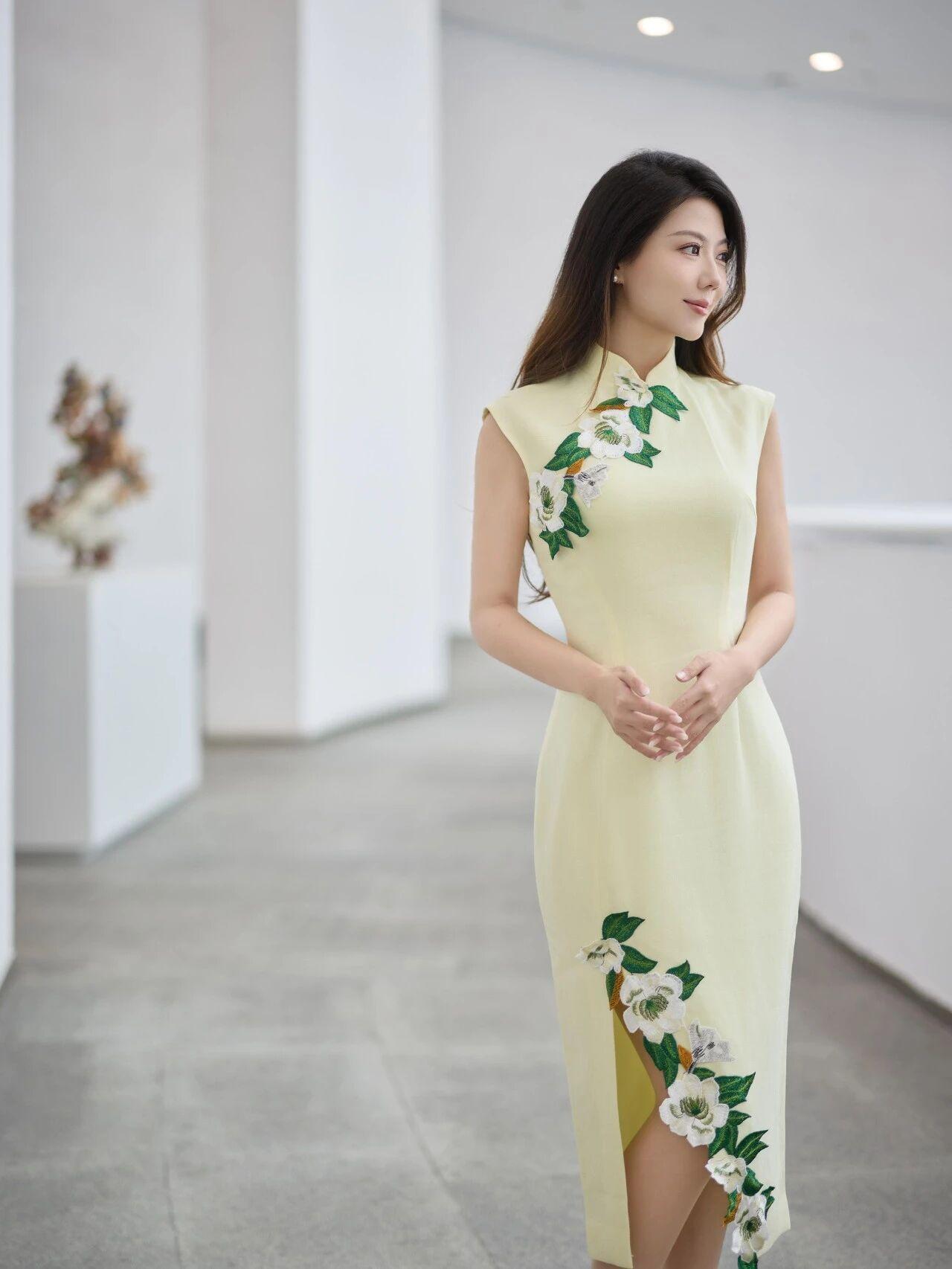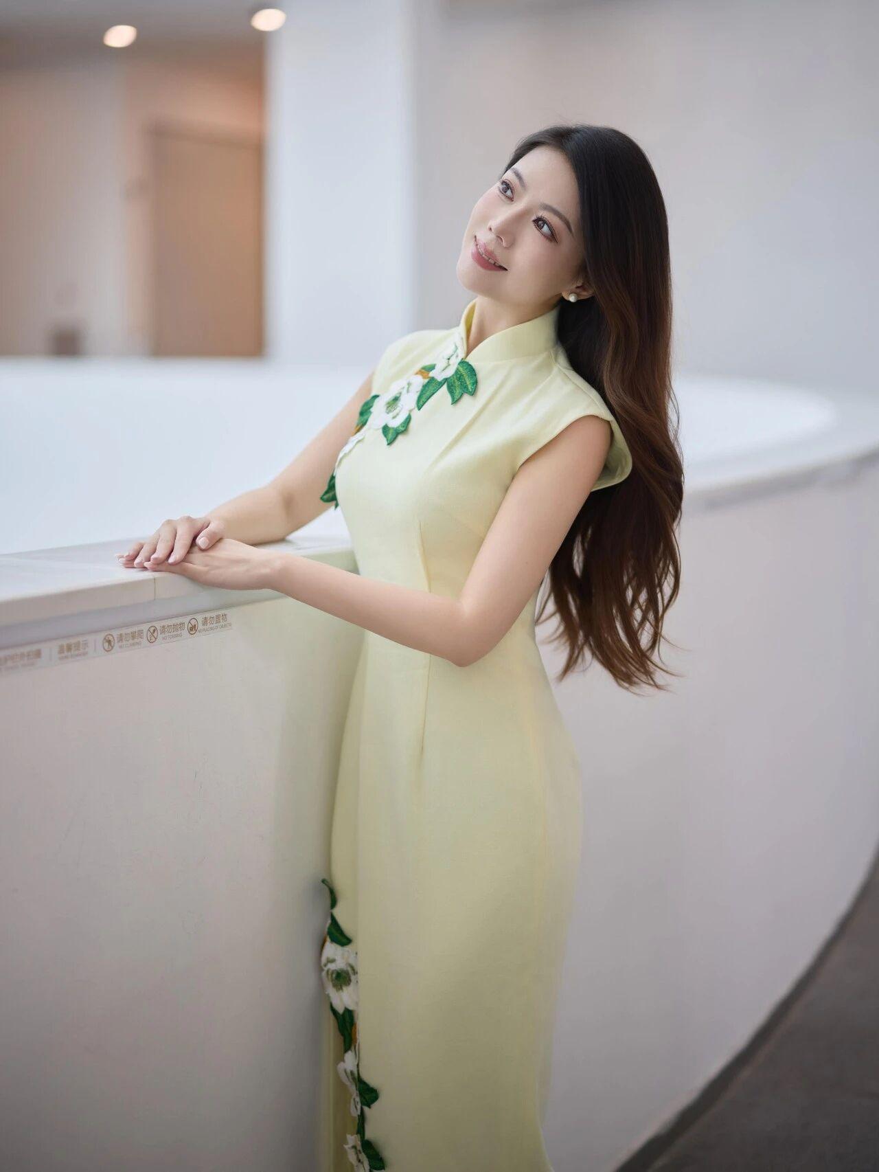 《时光里的温柔》 浅黄色旗袍像一泓温润的月光,轻轻裹住她纤细的身姿。衣料泛着淡淡的光泽,仿佛把整个午后的阳光都织了进去。绿色花卉刺绣从肩头蔓延至裙摆,每一片花瓣都带着江南烟雨的湿润感,针脚细密得如同工笔画的笔触。领口的盘扣像两朵含苞的玉兰,在颈间投下小巧的阴影。 深棕色长发如丝绸般垂落肩头,发梢微微卷曲的弧度里藏着风的形状。她嘴角的笑意比旗袍上的绣花更生动,眼波流转间,连空气都变得柔软。阳光穿过窗棂,在她睫毛上碎成星星点点的金粉,让那双含笑的眼眸像是盛着整个春天的湖水。 浅色瓷砖地面映着模糊的影子,像宣纸上晕开的水墨。栏杆上的标识文字在光线下若隐若现,像是时光留下的注脚。整个空间明亮得恰到好处,既不过分炙热也不显得清冷,就像她此刻的笑容,温暖却不灼人。旗袍下摆随着她站立的姿势自然垂落,裙角的刺绣在光影里微微颤动,仿佛那些绿色花卉正在悄然绽放。 背景墙面简洁得如同留白的画布,却衬得那抹浅黄愈发鲜活。她双手自然交叠在身前,指尖泛着珍珠般的光泽,与旗袍的温润相映成趣。阳光在地面织出菱形的光斑,把她的影子拉得修长,像是要把这个温柔的瞬间永远定格。空气中浮动着淡淡的光尘,连呼吸都变得轻柔,生怕惊扰了这幅会呼吸的画卷。